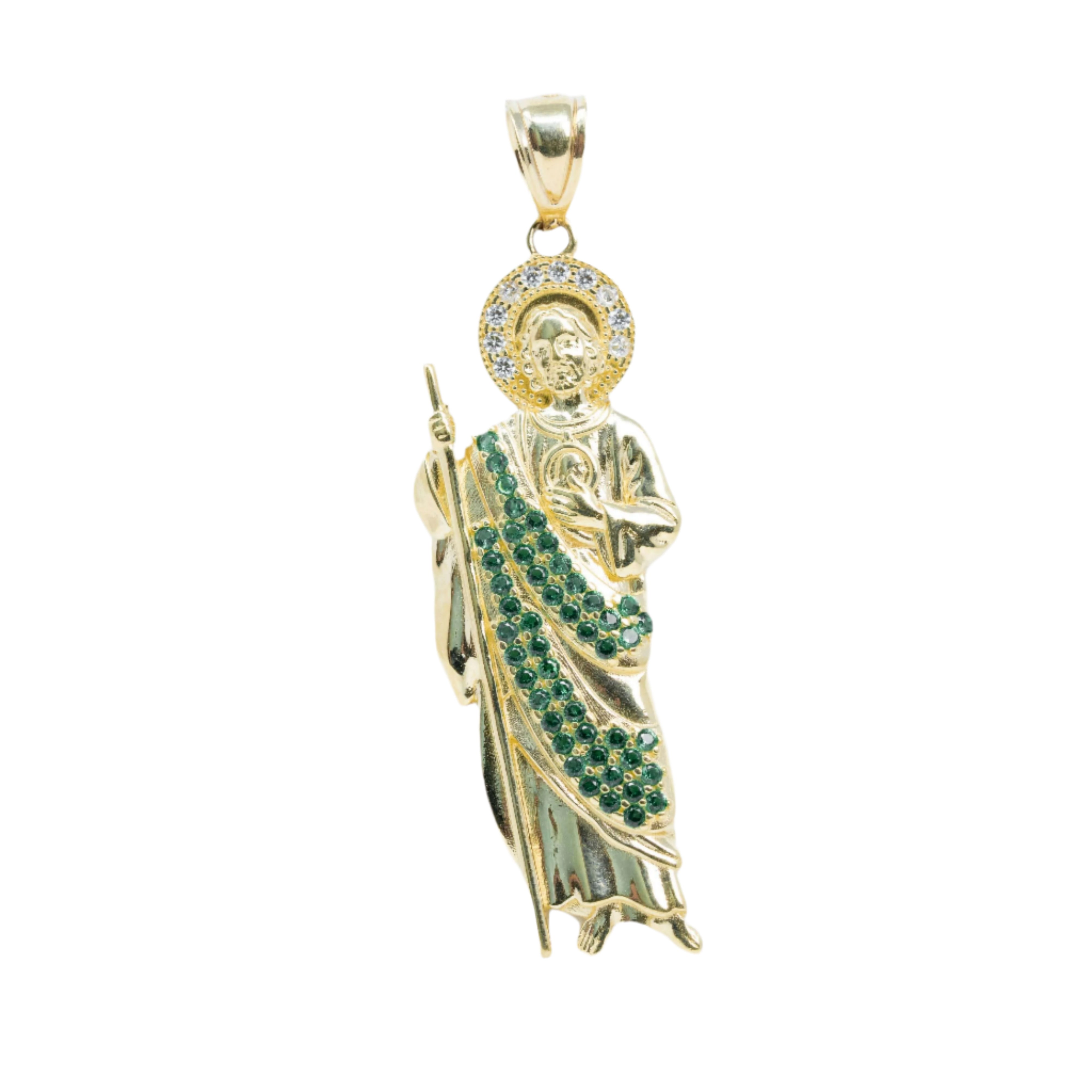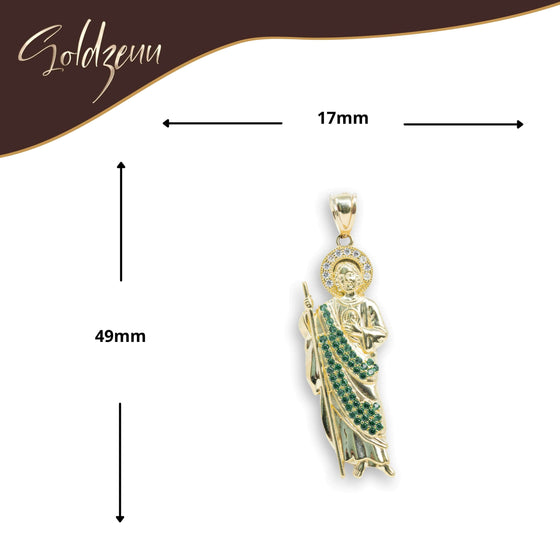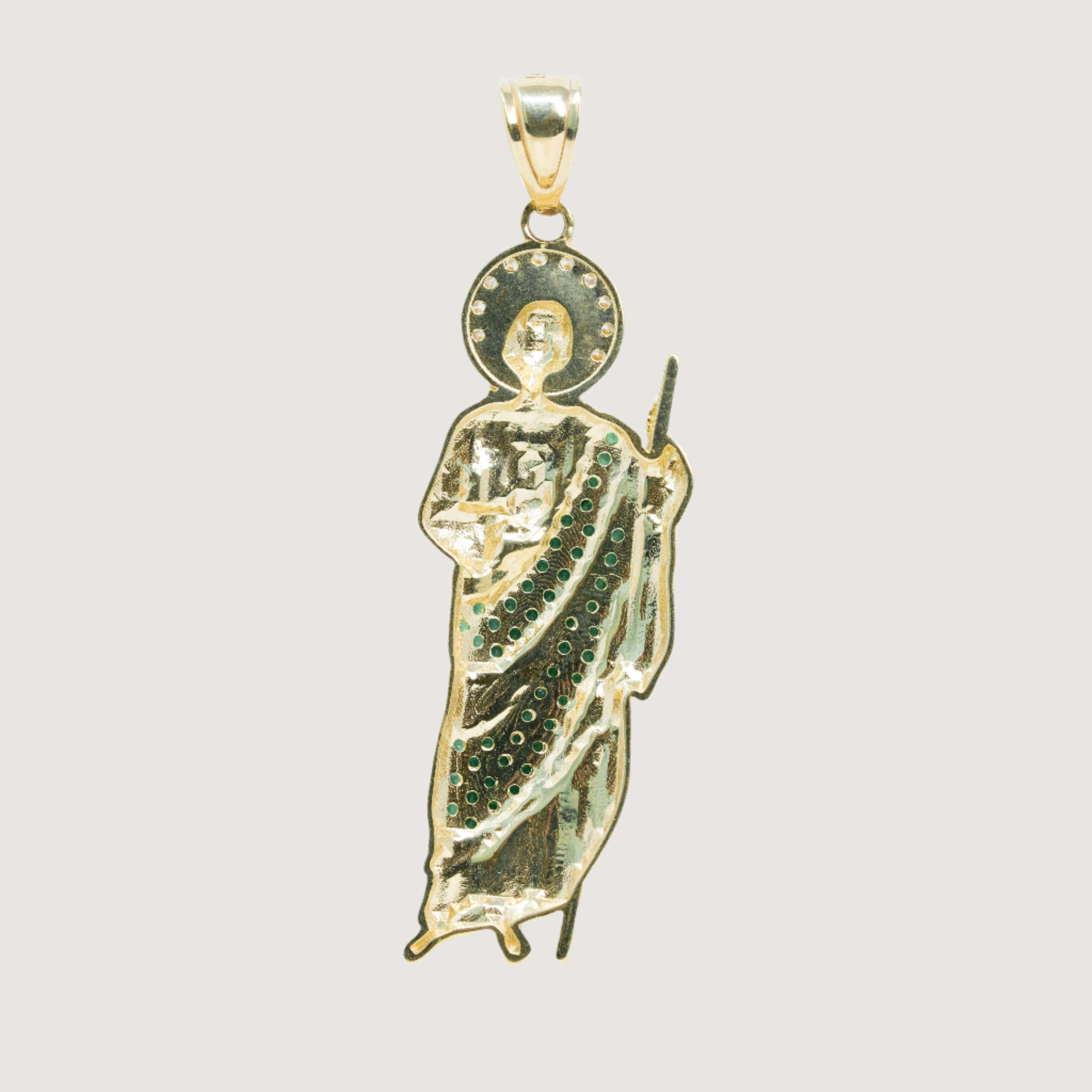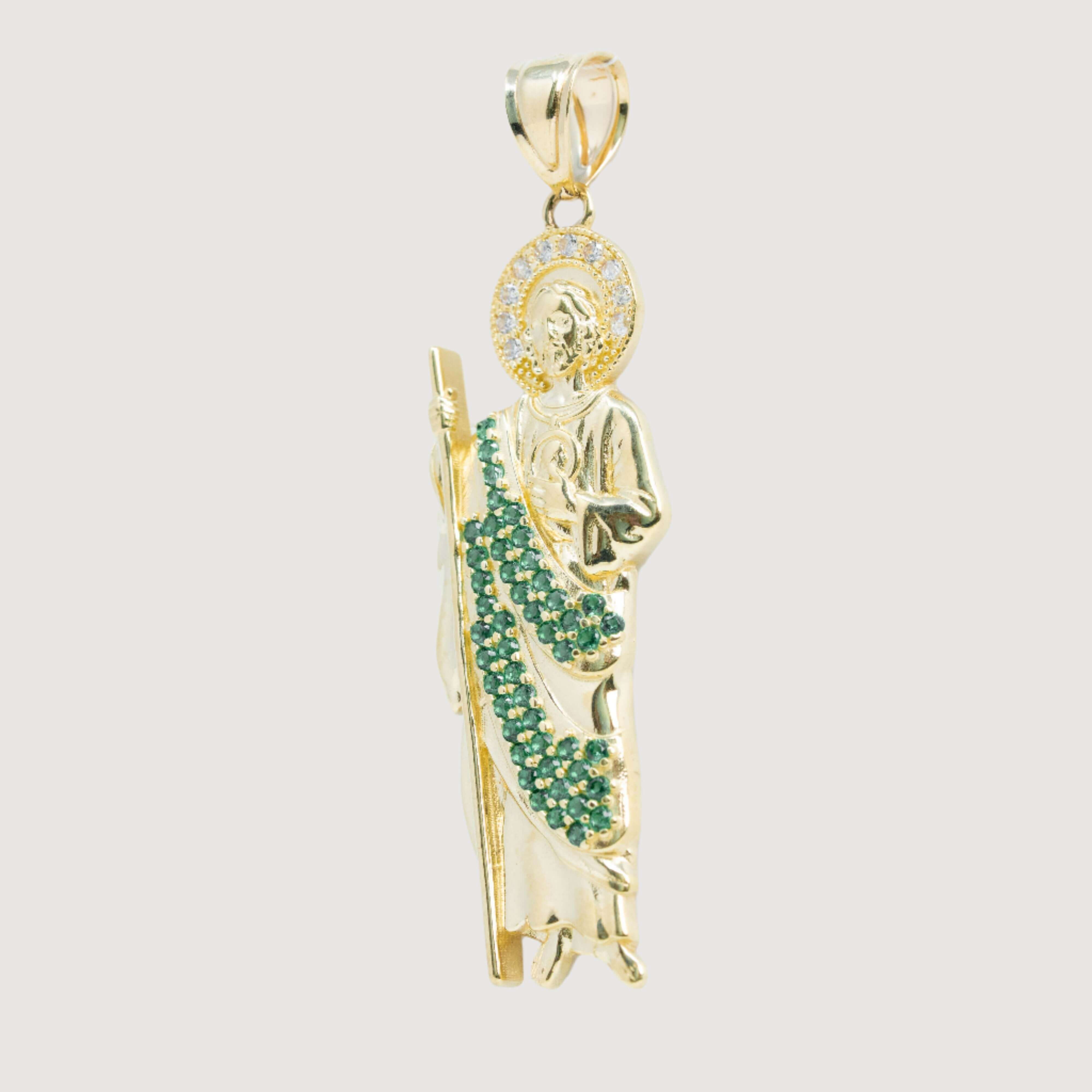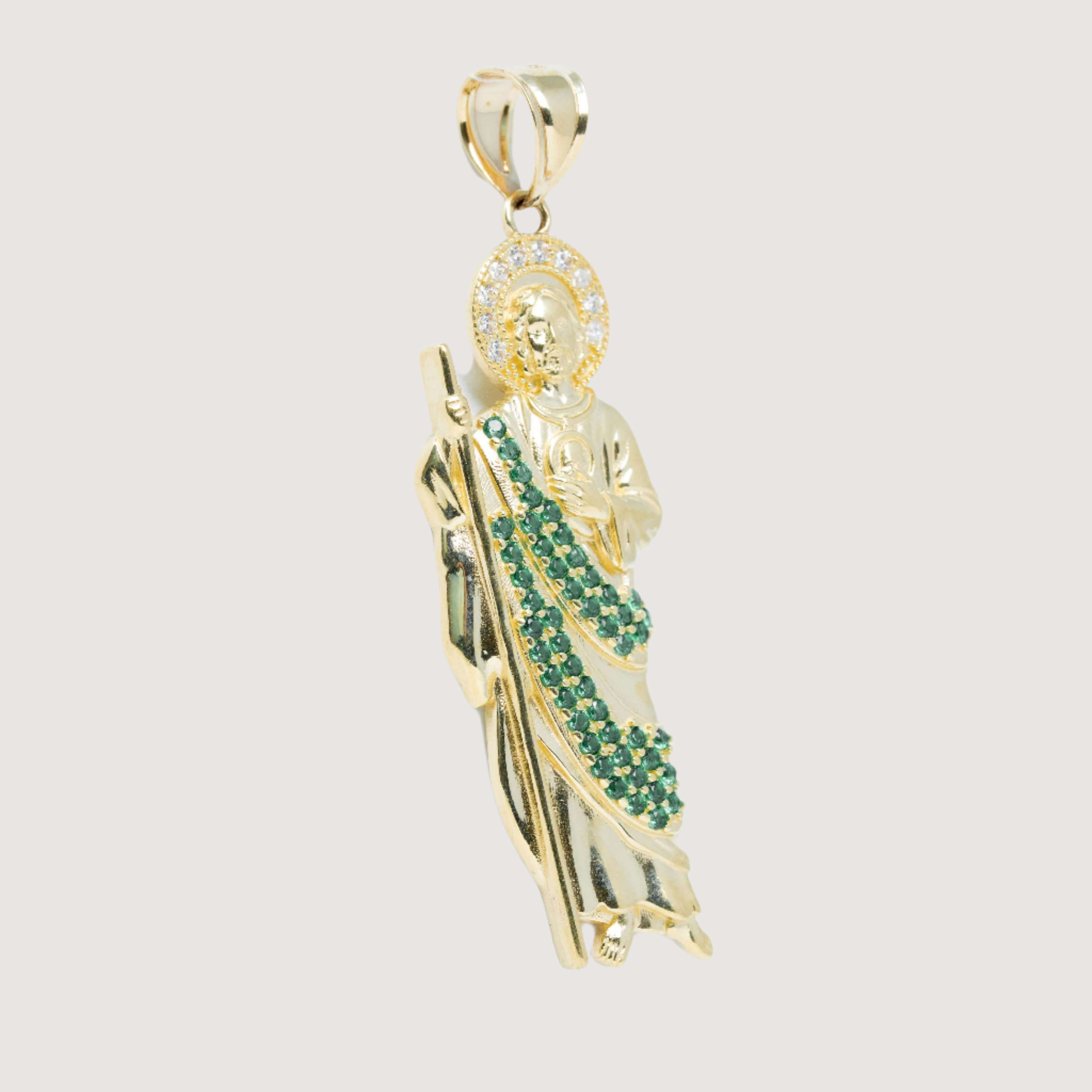 Saint Jude Pendant in 14K Yellow Gold – Green CZ Brilliance for Men
