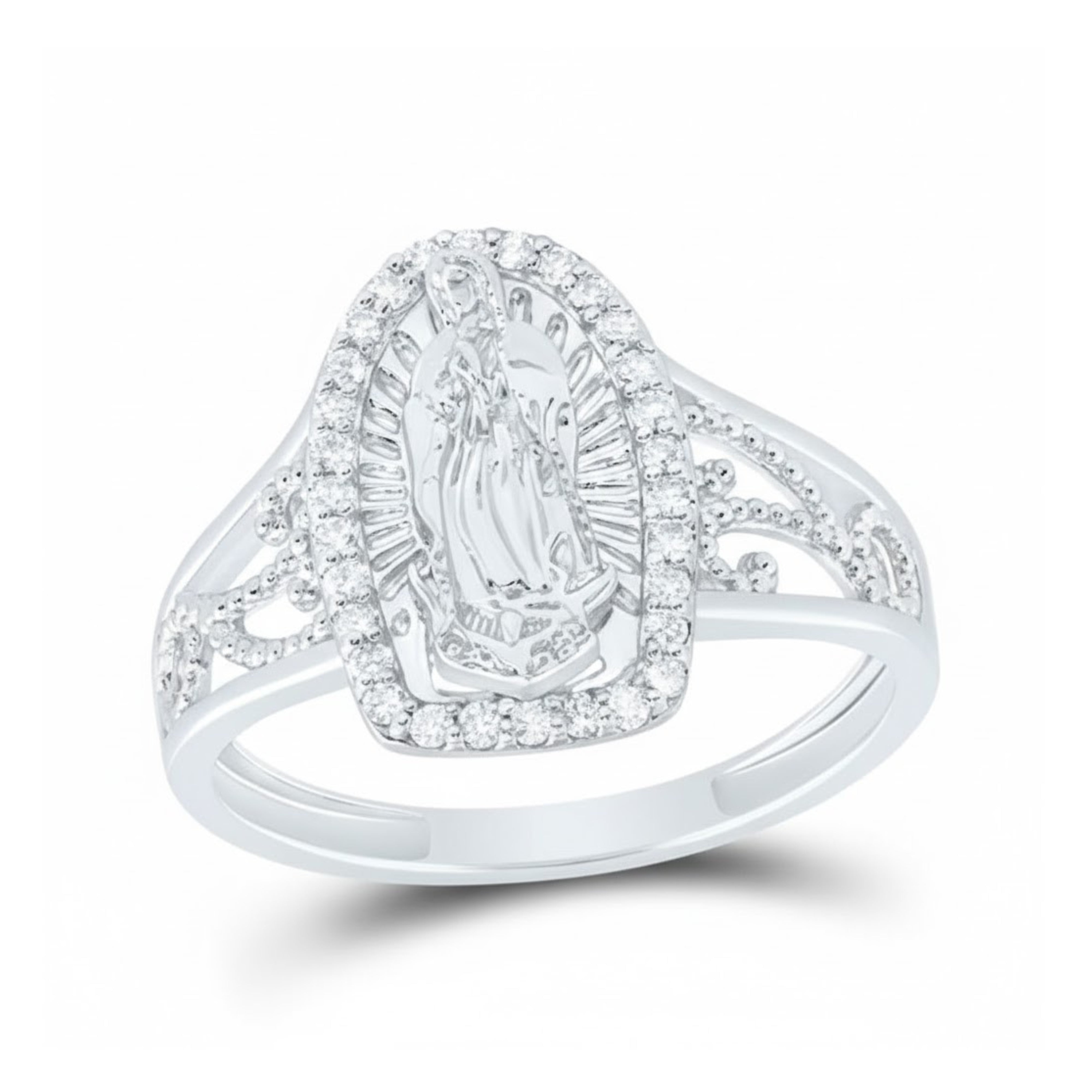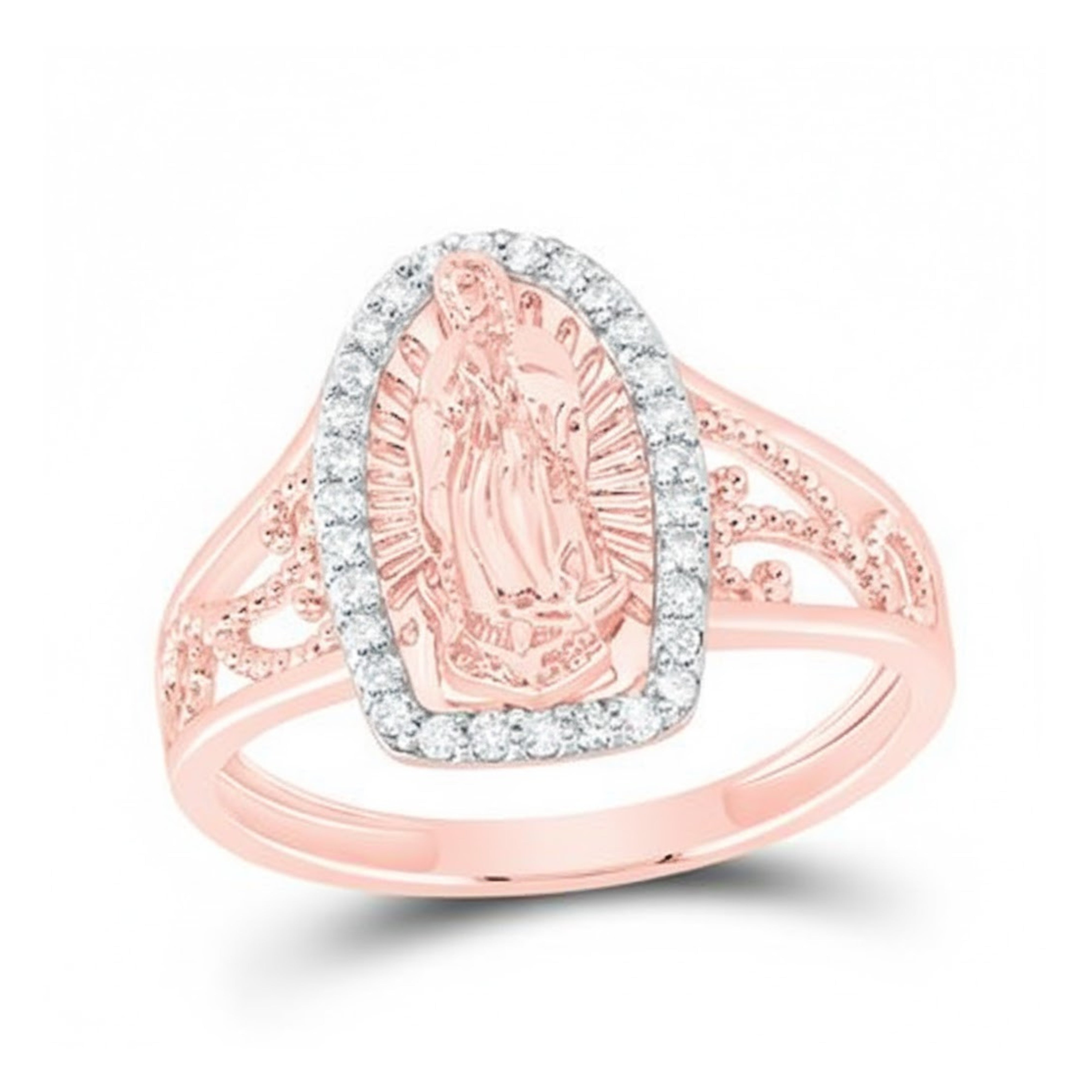 Celebrate faith and elegance with this 1/5CTW Virgin Mother Mary ladies ring, crafted in 14k yellow, rose, or white gold. Featuring sparkling diamonds totaling 1/5 carat, this ring blends devotion with contemporary style, making it a meaningful gift or a striking addition to your jewelry collection. Its versatile design ensures it can be worn daily or on special occasions, offering both spiritual significance and timeless beauty.