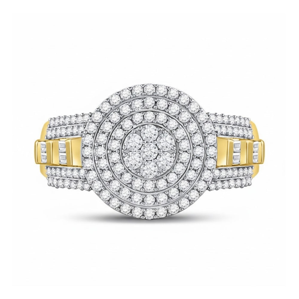 This 10k two-tone gold round diamond circle flower cluster ring features a total diamond weight of 1-1/5 Cttw. Crafted with precision, the elegant floral design is enhanced by brilliant diamonds set in two-tone gold for a stunning contrast. Ideal for special occasions or everyday luxury, this ring combines sophistication and timeless beauty.