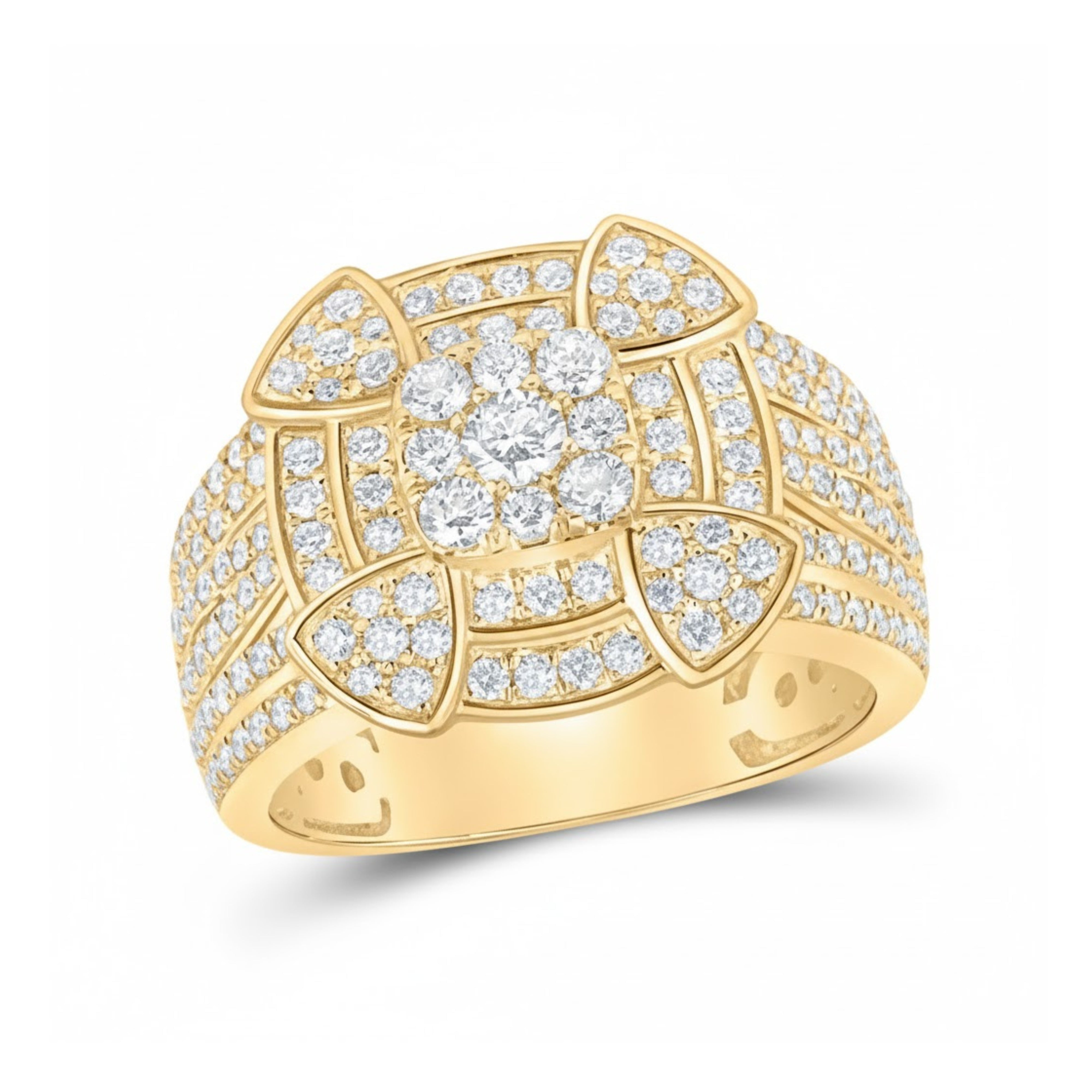 Crafted in luxurious 10k yellow gold, this statement ring features a breathtaking 1 & 5/8 carat total weight of round diamonds, meticulously pavé-set to create a dazzling, light-catching brilliance. With an approximate gram weight of 11.13, this piece offers a bold and substantial feel, perfectly balancing elegance and sophistication. Each diamond is expertly set to enhance its sparkle, making this ring a stunning expression of refined craftsmanship and timeless style.