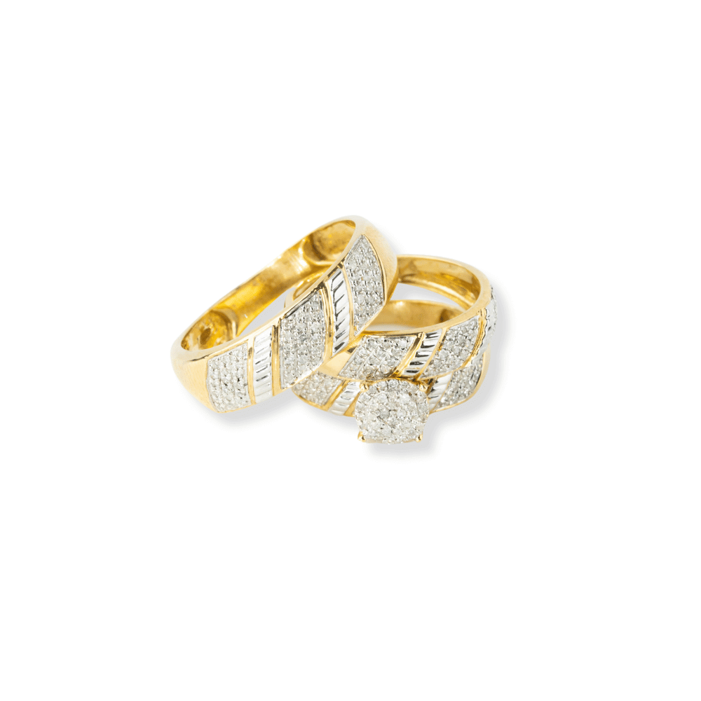 Celebrate your love with the 1/3 CTW 10K Yellow Gold Round Cut Wedding Trio Set. This stunning set includes a round-cut diamond engagement ring and two matching wedding bands, all crafted from radiant 10K yellow gold. The set features a total of 1/3 carat of diamonds, offering a perfect balance of sparkle and elegance. Ideal for couples seeking timeless and coordinated wedding rings, this gold wedding trio set embodies love, style, and sophistication for your special day.
