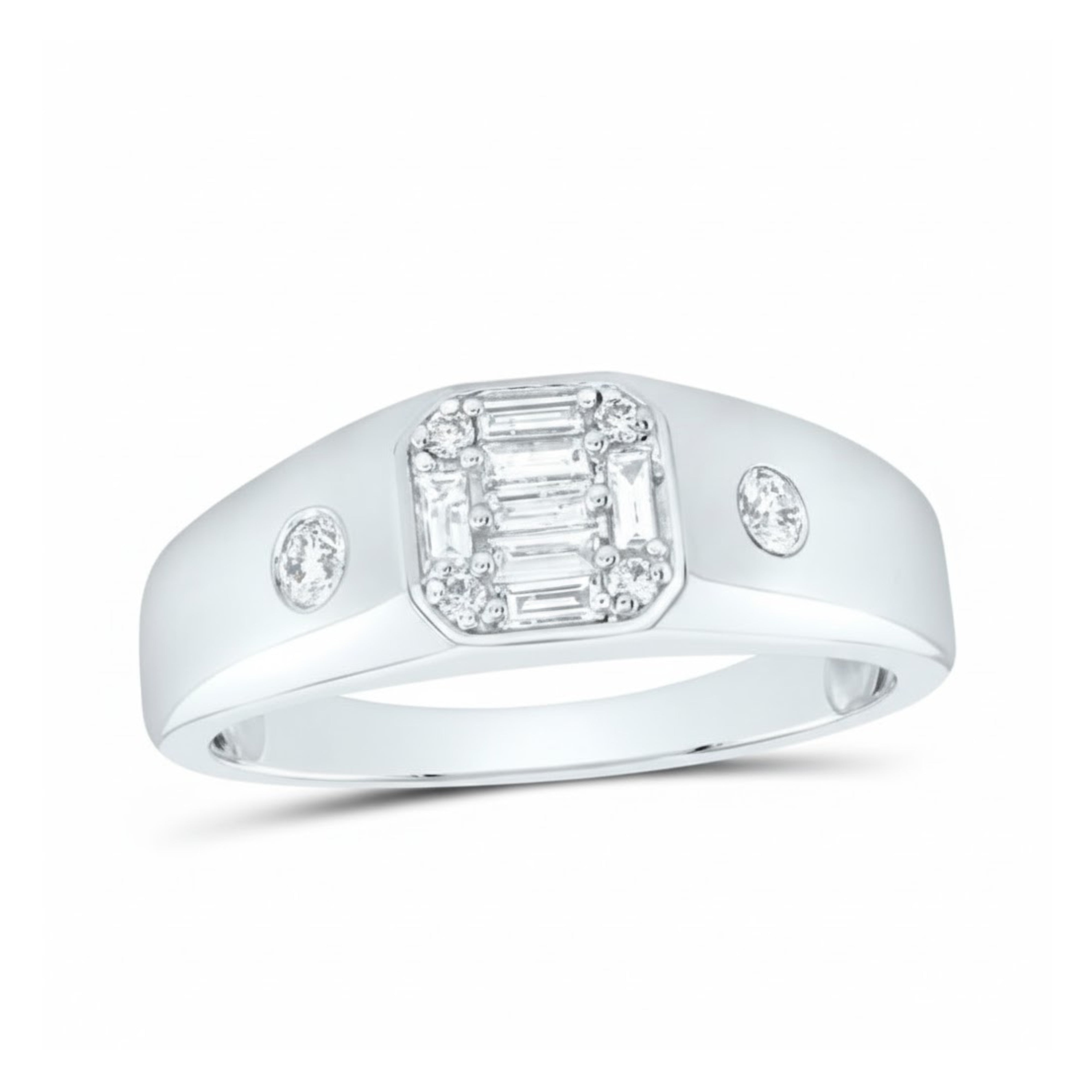 This elegant 10k Gold Baguette Diamond Band Ring 3/8 Cttw showcases a refined balance of brilliance and sophistication. Expertly crafted with a gram weight of approximately 4.37, the ring features a captivating arrangement of baguette-cut diamonds, channel-set at the center, complemented by round diamonds prong-set along the band. The G-H color and I1-I2 clarity of the accent stones enhance the ring’s luminous sparkle, creating a timeless and radiant look. With a total diamond weight of 3/8 carat, this band ring beautifully combines modern style with classic elegance—perfect for weddings, anniversaries, or as a luxurious everyday accessory.