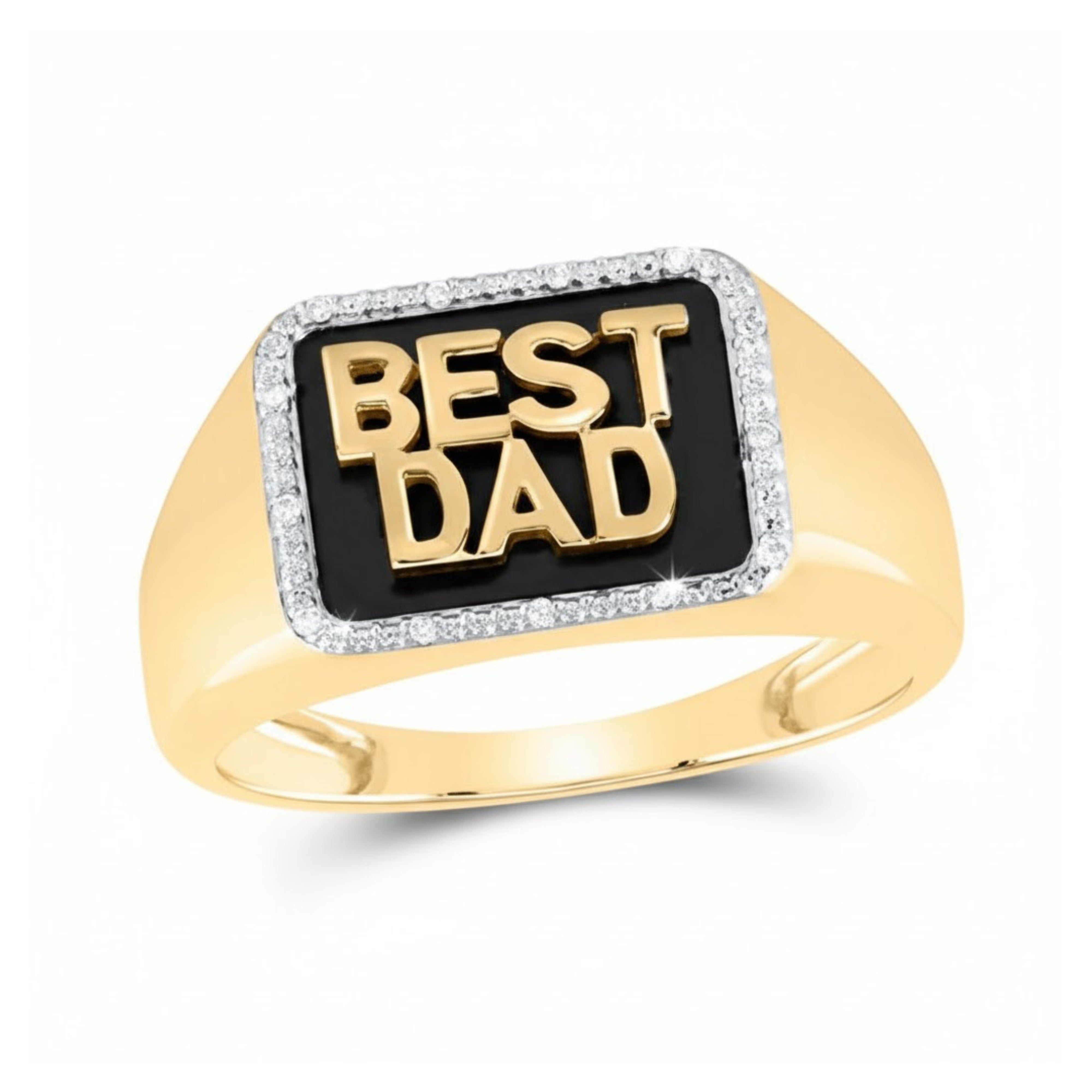 Crafted in genuine 10k gold, this BEST DAD band ring is a heartfelt tribute to fatherhood. Featuring round, prong-set diamonds totaling 1/20 carat, this elegant piece shines with both meaning and brilliance. Available in classic yellow gold and sleek white gold, the design blends durability with timeless style—making it a perfect gift to honor the love, strength, and guidance of a devoted father.