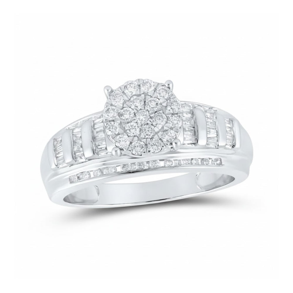 This exquisite bridal engagement ring is crafted with an approximate weight of 4.347 grams and features a total gemstone carat weight of 1/2 CT. The design highlights a 0.23 CT round diamond set in a pave setting as the centerpiece, complemented by 0.17 CT baguette diamonds in a channel setting and 0.13 CT round diamonds also channel-set. Each diamond is carefully selected for its brilliance and set in a timeless arrangement, creating a sparkling, elegant piece perfect for engagements or special occasions.