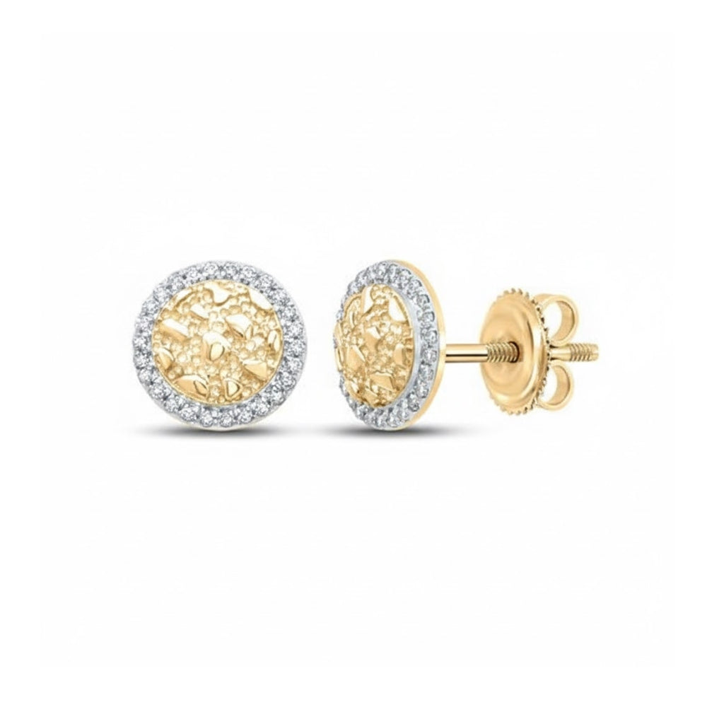 These 10k yellow gold round diamond nugget circle earrings feature a total carat weight of 1/8 CT. Expertly crafted for lasting shine and durability, they offer a stylish, elegant look suitable for everyday wear or special occasions. Their unique nugget design and brilliant diamonds create a subtle sparkle, making them a versatile addition to any jewelry collection.