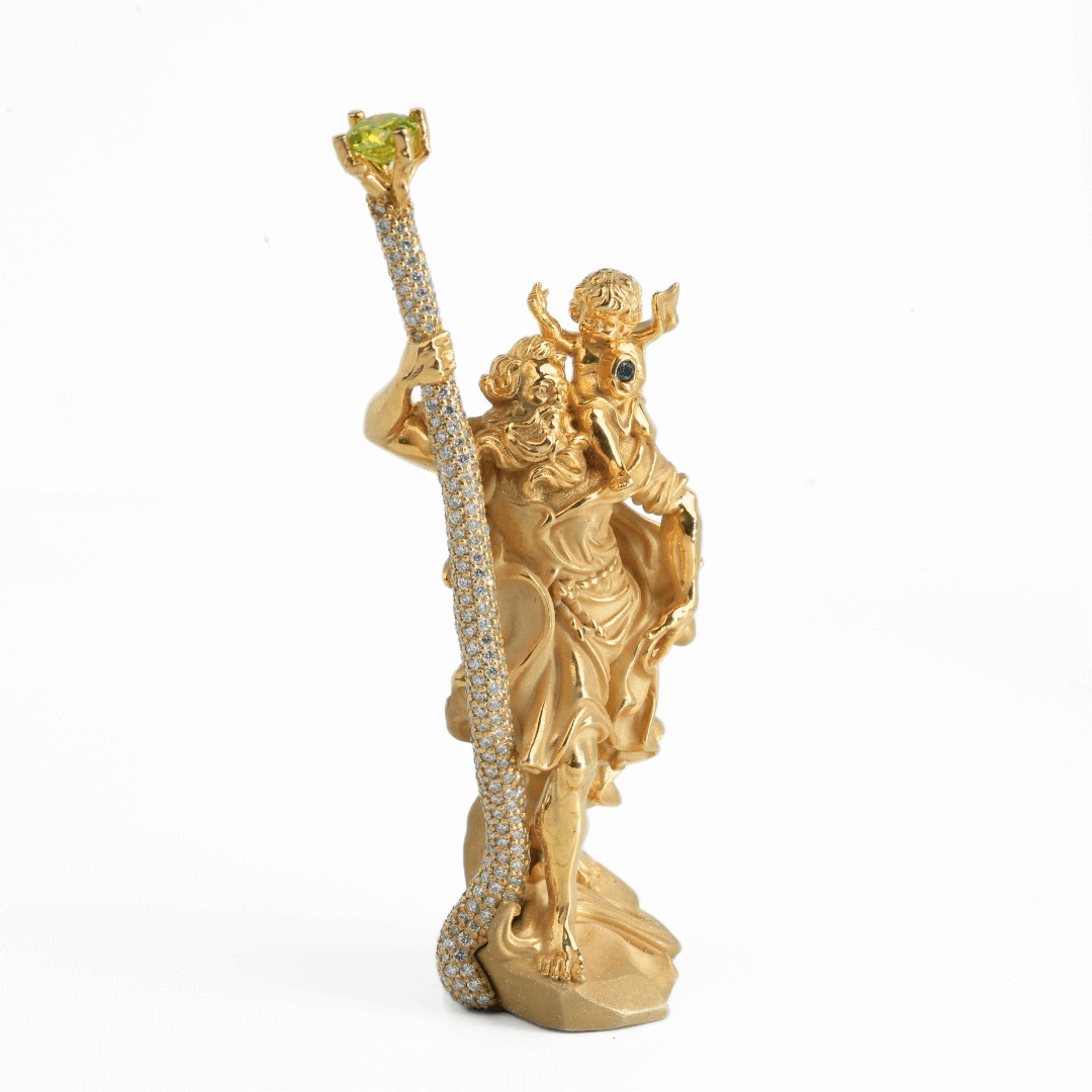 This isn't just any gold pendant; it's a unique interpretation brought to life with exceptional detail. Saint Christopher's staff gleams, entirely "iced out" with brilliant, Excellent cut VS clarity lab-grown diamonds. Crowning the staff is a captivating Canary Green diamond, adding a distinctive touch of color. Further enhancing the design, a vibrant Blue diamond rests upon the chest of the angel figure Saint Christopher carries, creating stunning focal points against the warm 14k gold.