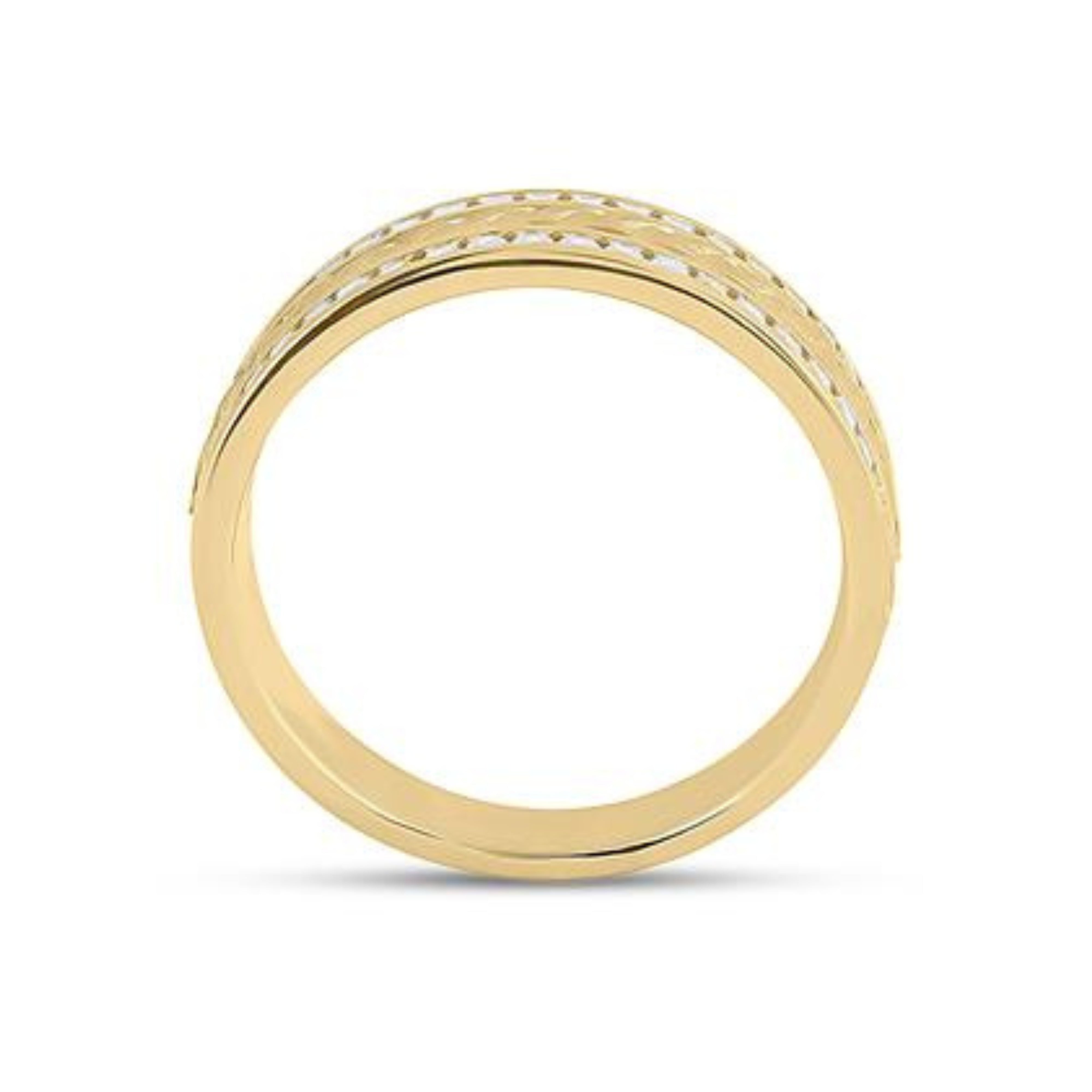 This elegant 14k Gold Round Diamond Braided Wedding Band Ring showcases timeless beauty and sophistication. Crafted with a gram weight of approximately 7.63, it features brilliant round diamonds totaling 1/2 carat. Each diamond is meticulously channel-set, ensuring a seamless flow of sparkle and durability. The design beautifully intertwines classic craftsmanship with modern elegance, making it the perfect choice for a wedding band or a symbol of lasting love.