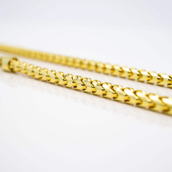alt=" Shop our 10K Yellow Gold Franco Chain - 3.5mm width. Timeless, durable & versatile solid gold necklace. Perfect solo or with pendants. "