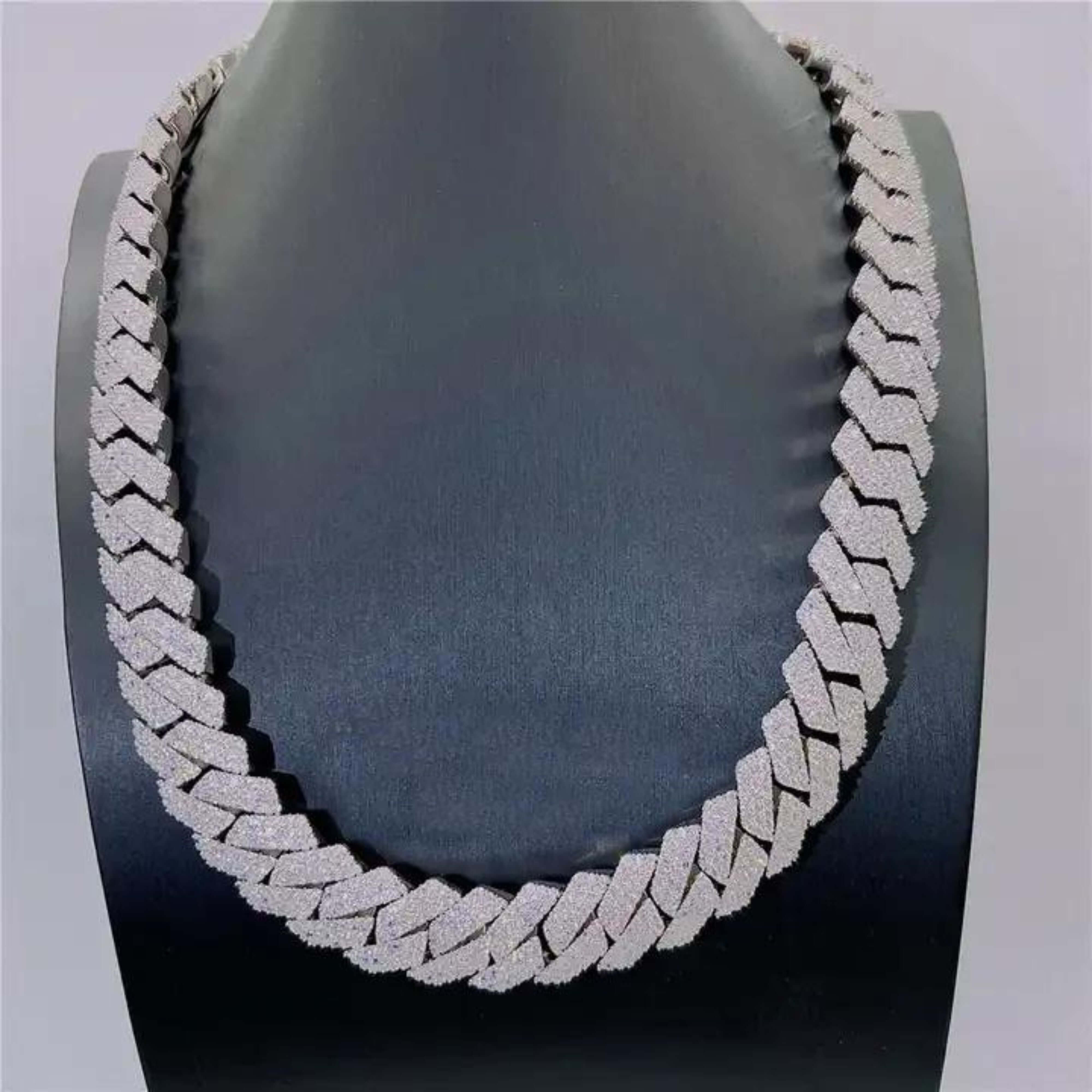 The 20mm Moissanite Cuban Link Chain (3 Rows) in 925 Sterling Silver is the ultimate blend of bold design and luxurious craftsmanship. Featuring a striking 20mm Cuban link design, this chain is meticulously adorned with radiant moissanite stones, offering brilliance that rivals diamonds. Crafted from premium 925 sterling silver, it is polished to perfection for a sleek, mirror-like finish that exudes sophistication.