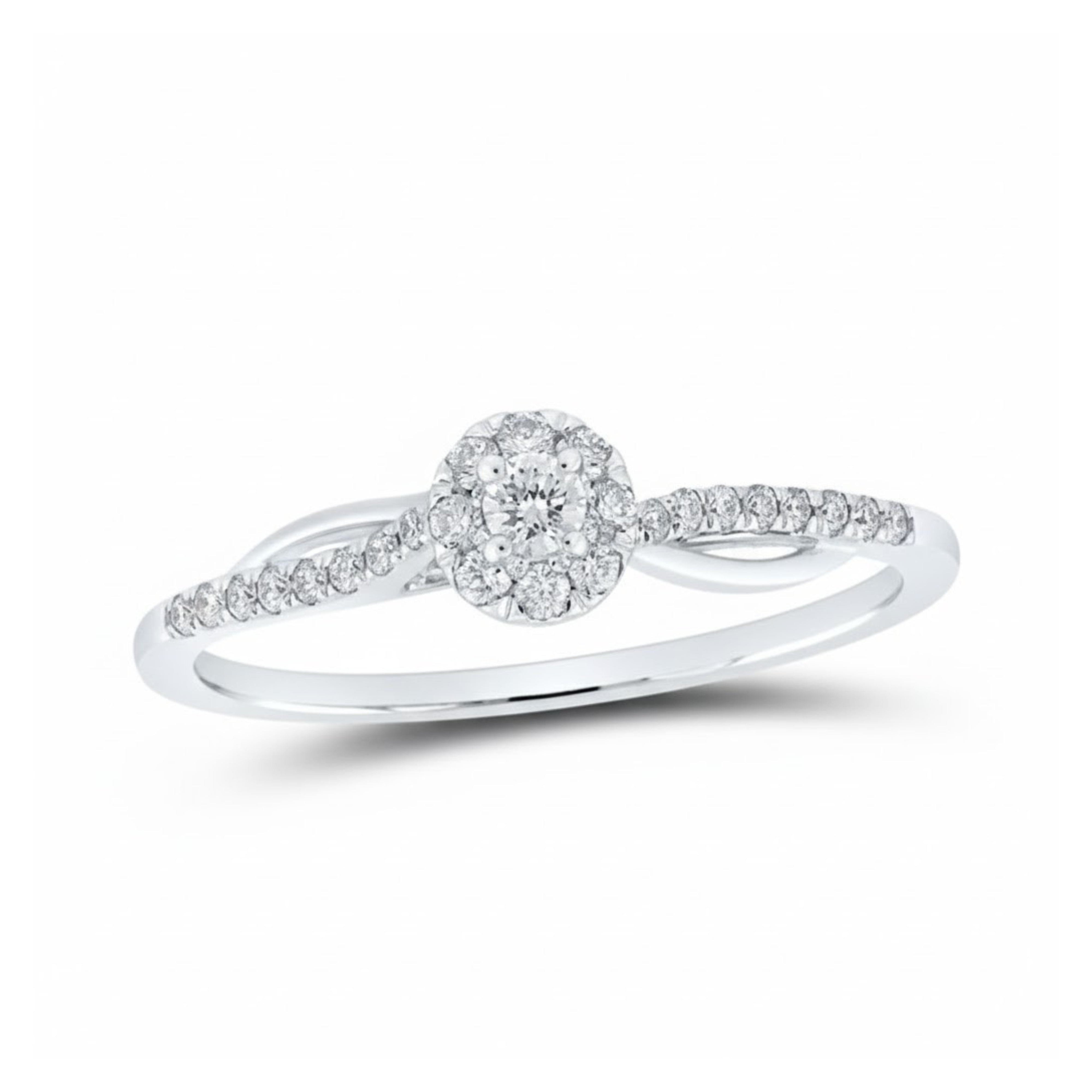 Celebre el amor y el compromiso con este anillo de compromiso de oro de 10k con halo de diamantes redondos de 1/5 quilates , bellamente elaborado para simbolizar la elegancia y la devoción. Brillantes diamantes redondos forman un halo radiante, creando un diseño atemporal y romántico.