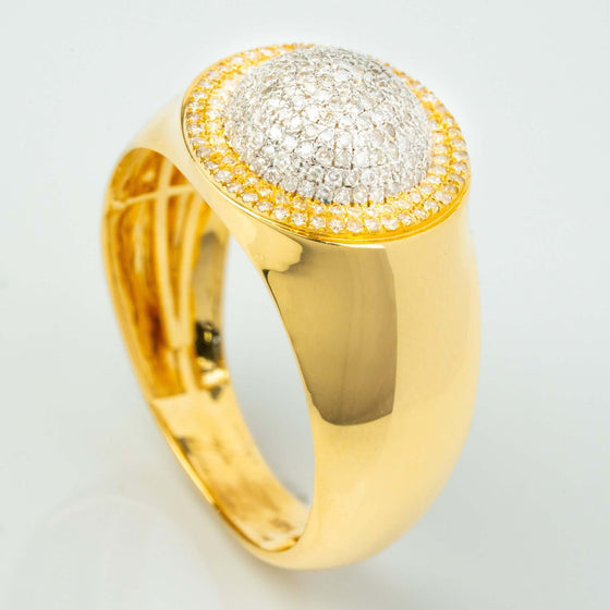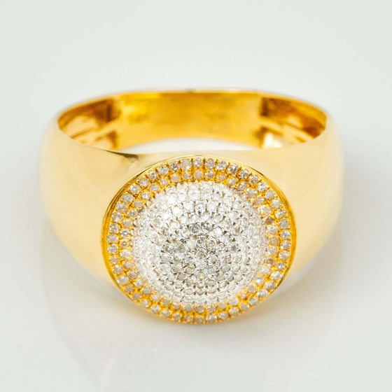 Elevate your style with our Men's Diamond Gold Ring, a masterpiece that exudes luxury and sophistication. Crafted from 14K yellow gold, this bold design features a gleaming top encrusted with 0.49 carat total weight (CTW) of round, natural diamonds. The meticulously placed diamonds create a striking display of brilliance, perfectly complemented by the rich, warm hue of the gold band. Ideal for any occasion, this timeless piece is the perfect symbol of achievement and class. Whether you're dressing for success or marking a milestone, this ring ensures you stand out with confidence.