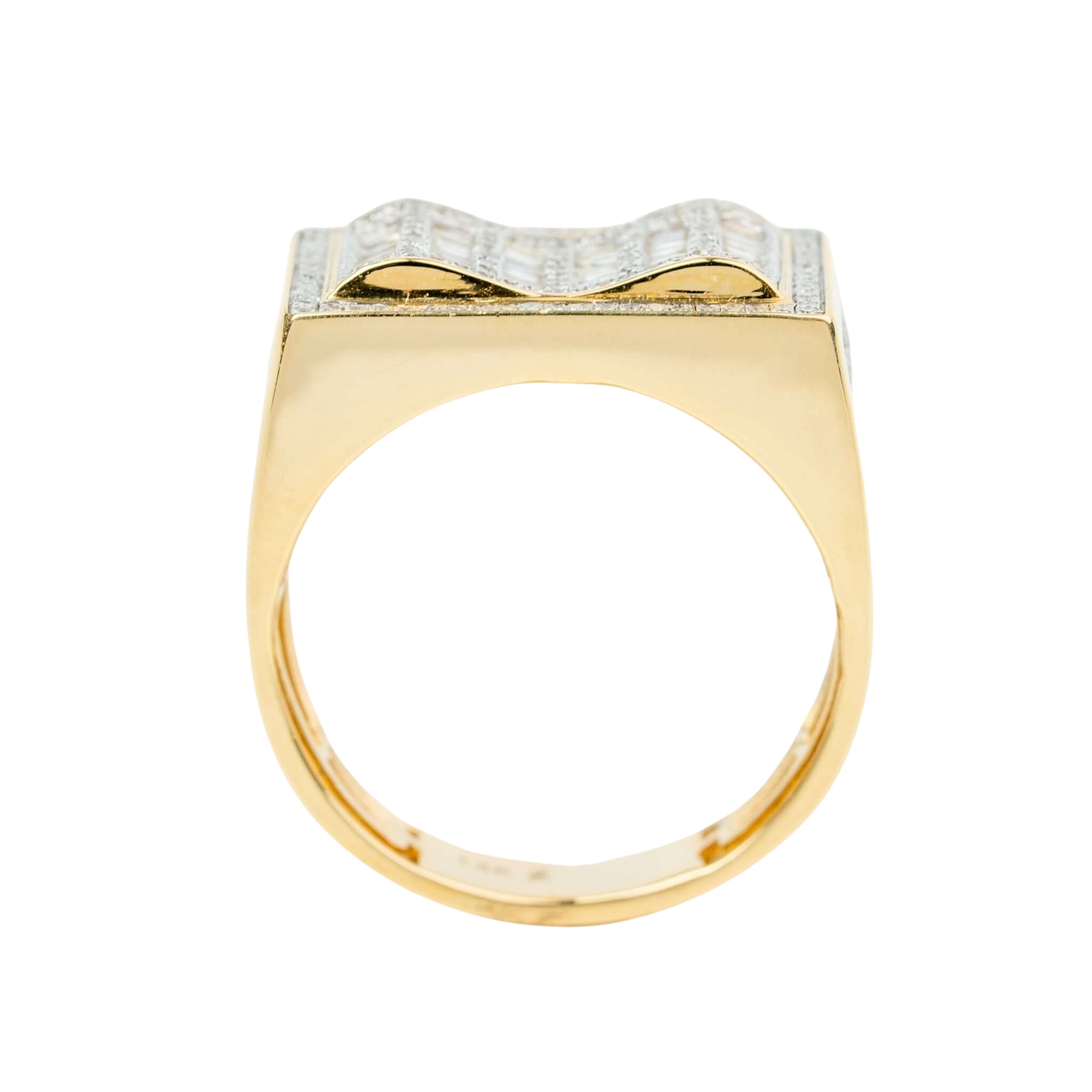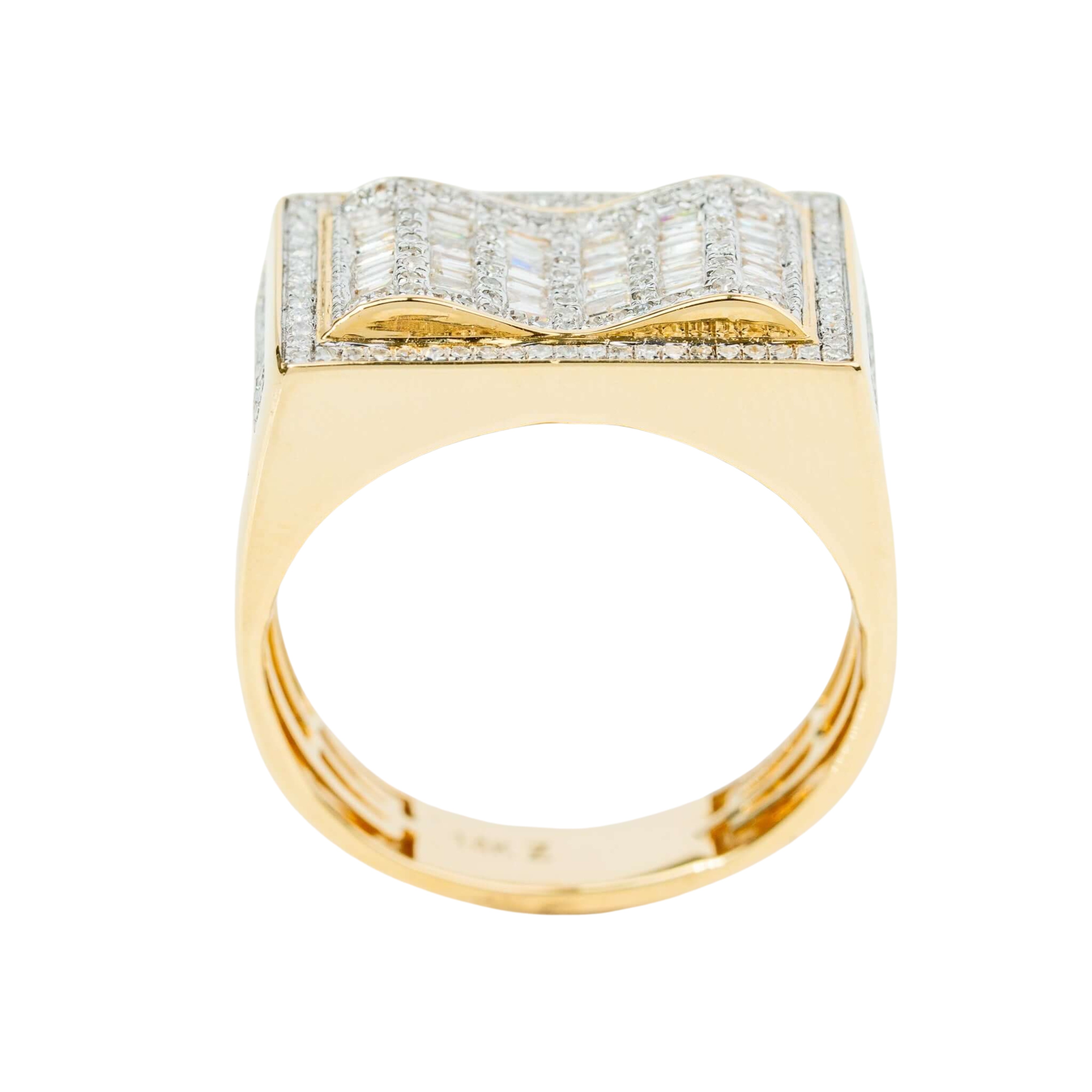 Experience bold luxury with this Men’s Diamond Cluster Ring, expertly crafted from 14K yellow gold. The distinctive design showcases a rectangular face adorned with 0.73 CTW of natural diamonds, arranged in a captivating wave-like pattern that catches the light from every angle. Framed by additional diamond accents along the sides, the top exudes an air of timeless sophistication. The sleek gold band provides a sturdy yet comfortable fit, seamlessly blending classic refinement with contemporary flair.