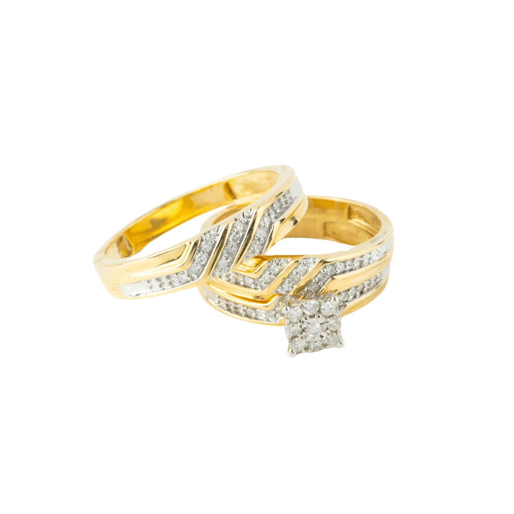 alt=" Discover the 1/3 CTW 10K Yellow Gold Round Cut Wedding Trio Set. Perfect engagement rings for eternal love and commitment. "