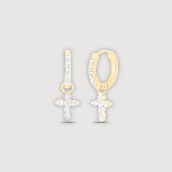 alt=" Elevate your style with gold earrings featuring 1/8CTW diamond crosses and a chic hoop design, perfect for any occasion. "