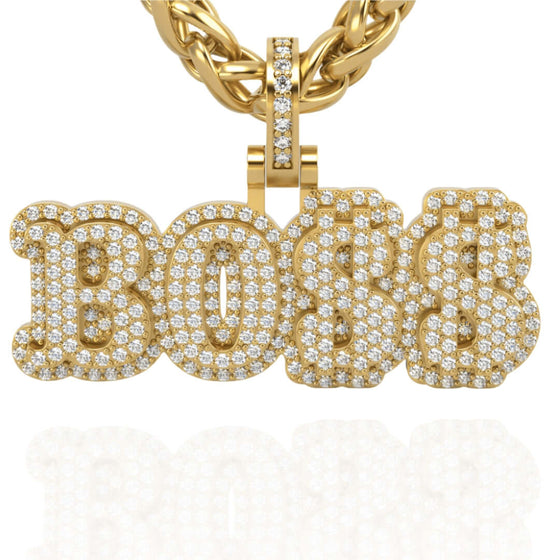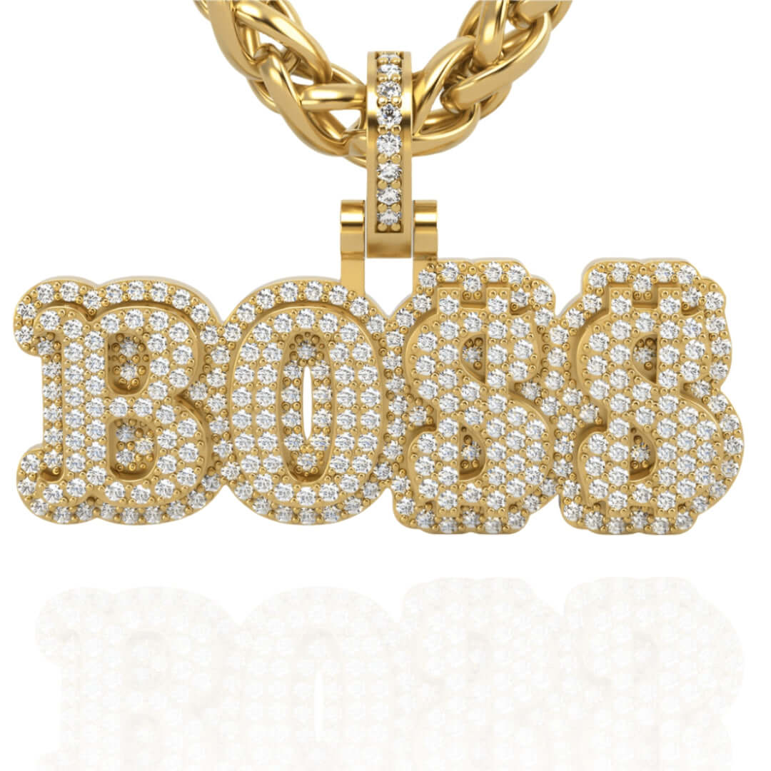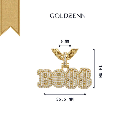 Alt="Showcase confidence with the 14K Gold BOSS Pendant. Features radiant 14K gold, bold lettering, and diamond accents for a luxurious and powerful statement."
