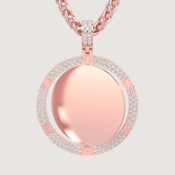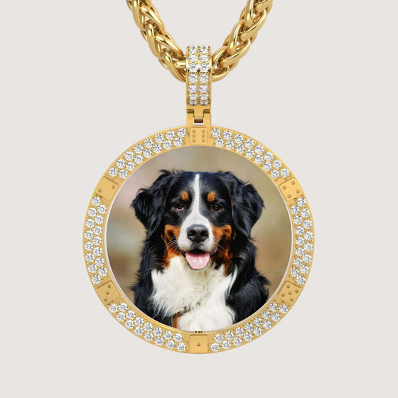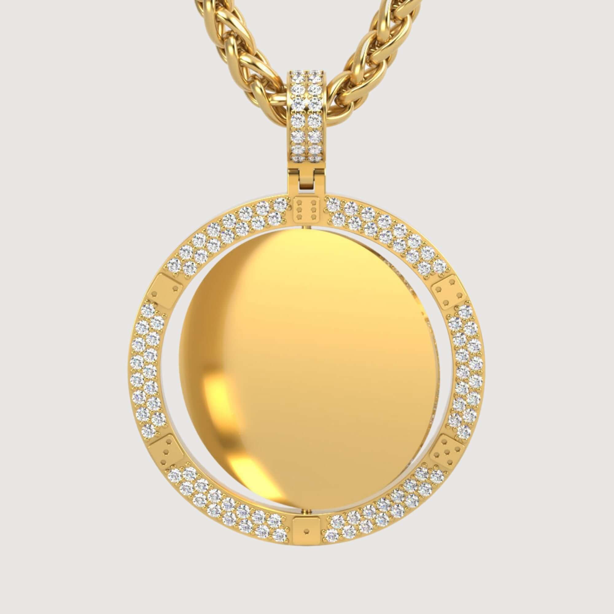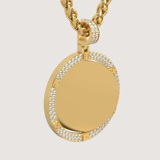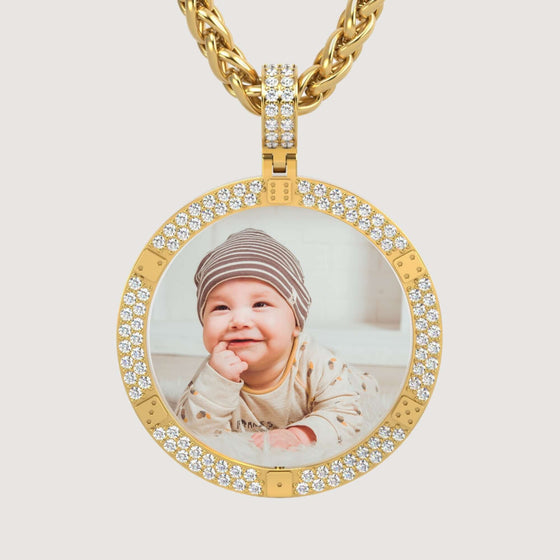 alt=" A timeless 14K gold round picture pendant with diamond accents. Perfect for showcasing cherished memories with luxury and style. Handcrafted and made to order. "