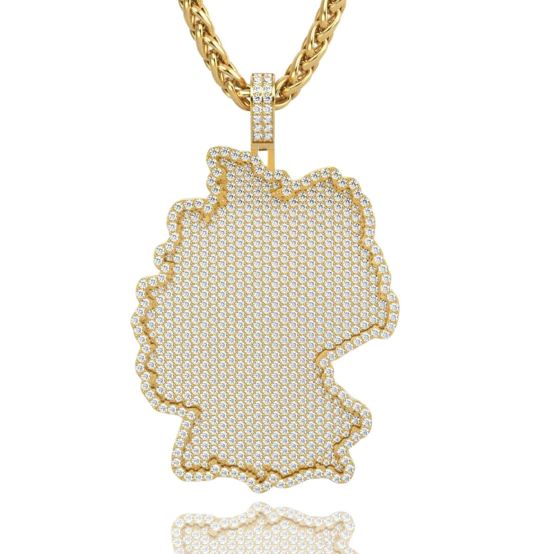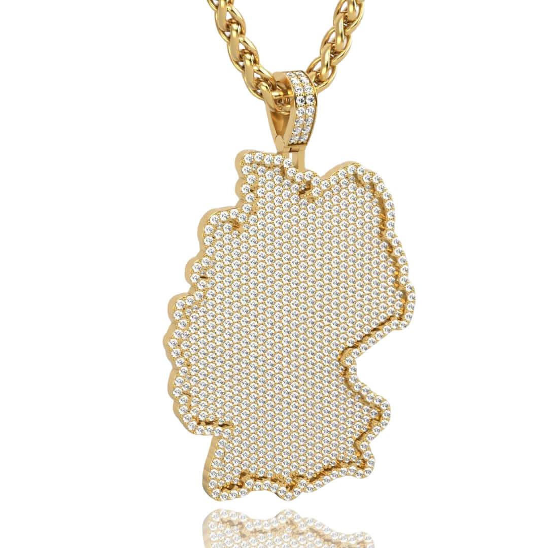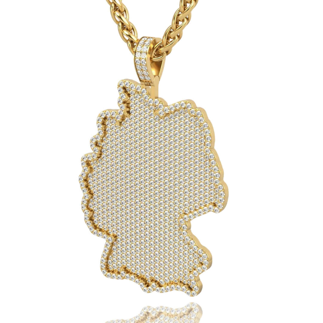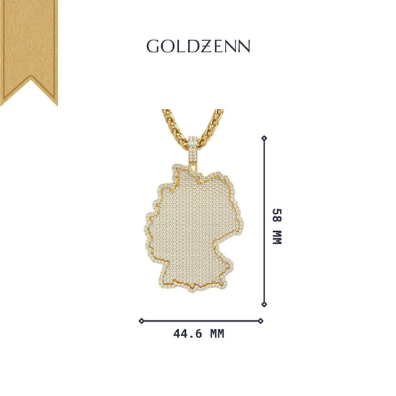 Alt="Showcase heritage with the 14K Gold Germany Map Pendant. Features radiant 14K gold, intricate detailing, and diamond accents for timeless sophistication."