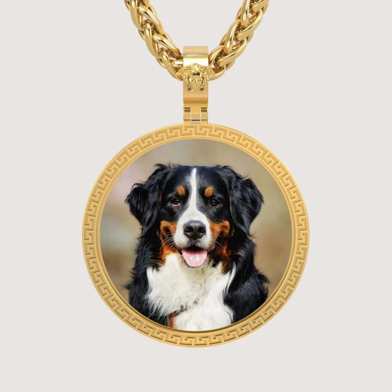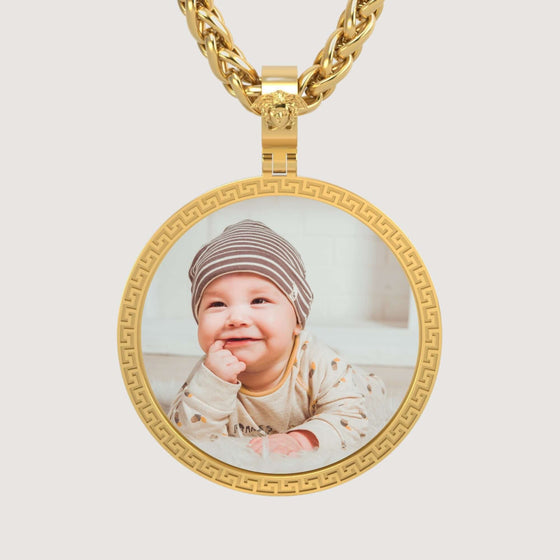 alt=" Crafted in 14K gold, this Greek Key round picture pendant features a timeless design to showcase your cherished memories with cultural elegance and luxury. "