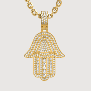 Alt="Celebrate protection and luck with the 14K Gold Hamsa Hand Pendant. Features intricate detailing, radiant 14K gold, and diamond accents for timeless sophistication."