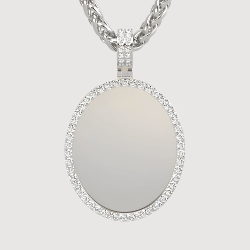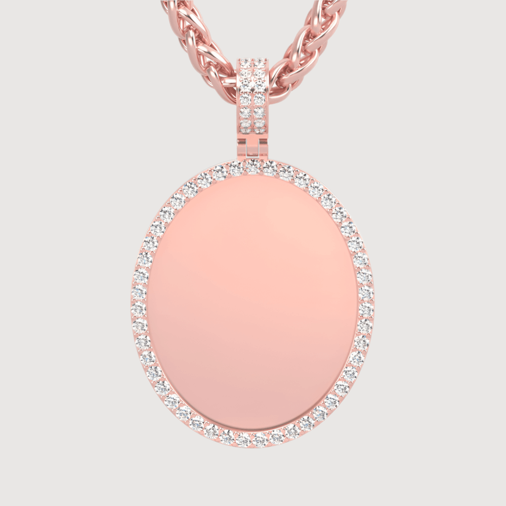 The 14K Gold Oval Picture Pendant with Diamonds is a stunning and sentimental piece that allows you to keep cherished memories close. Crafted from radiant 14K gold, this elegant pendant features an oval frame adorned with sparkling diamonds, adding a touch of luxury to your personalized keepsake. The center is customizable, allowing you to insert a photo or design that holds special meaning.