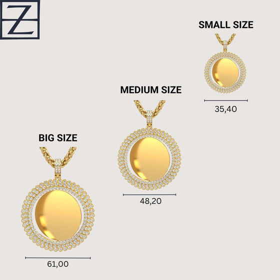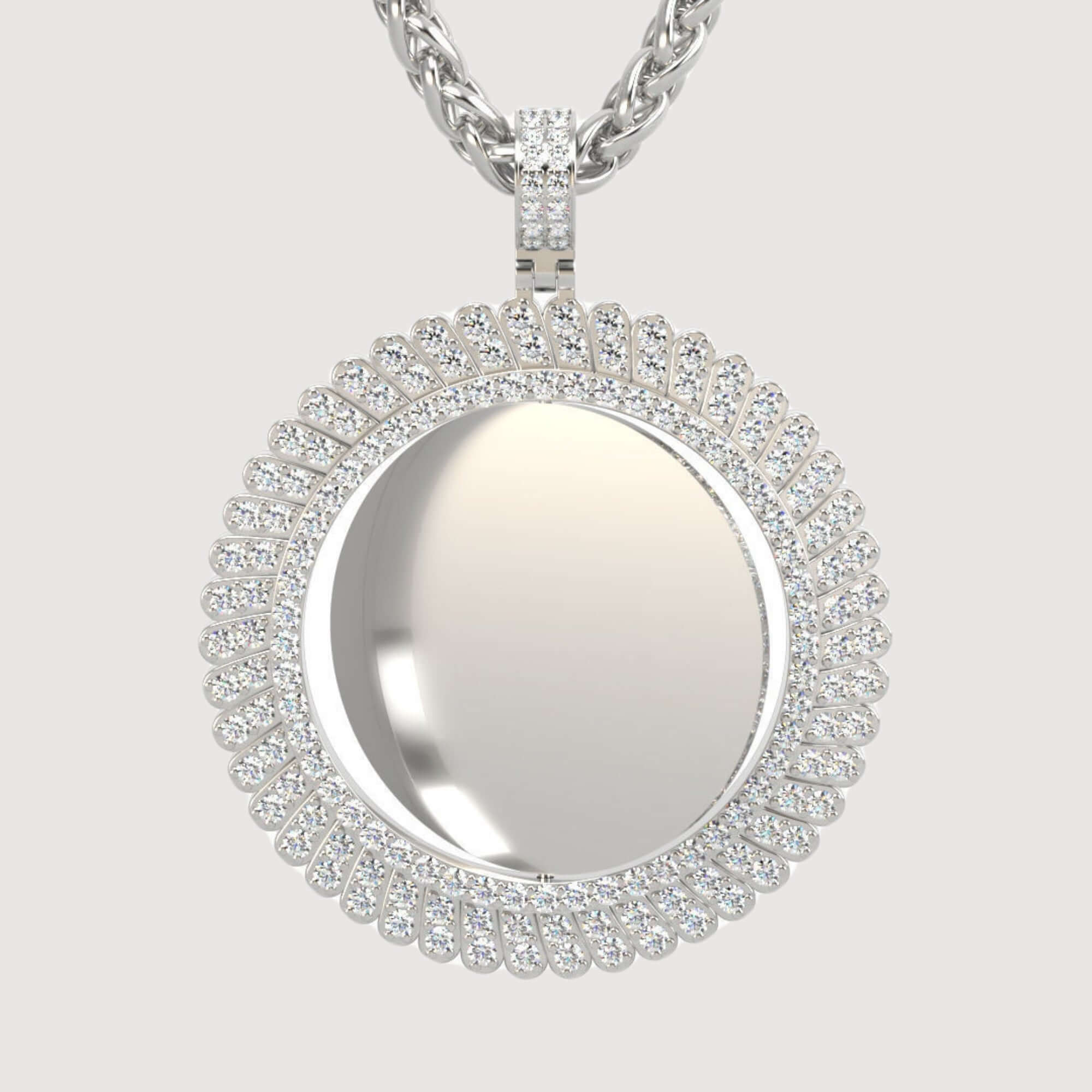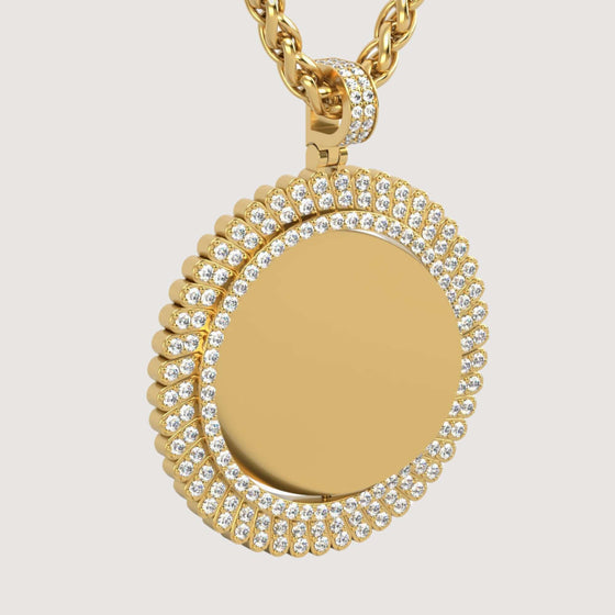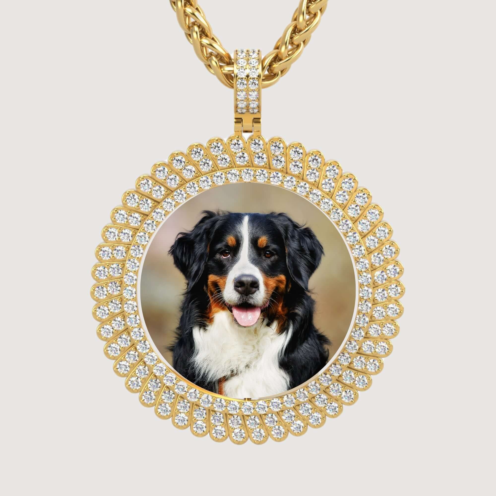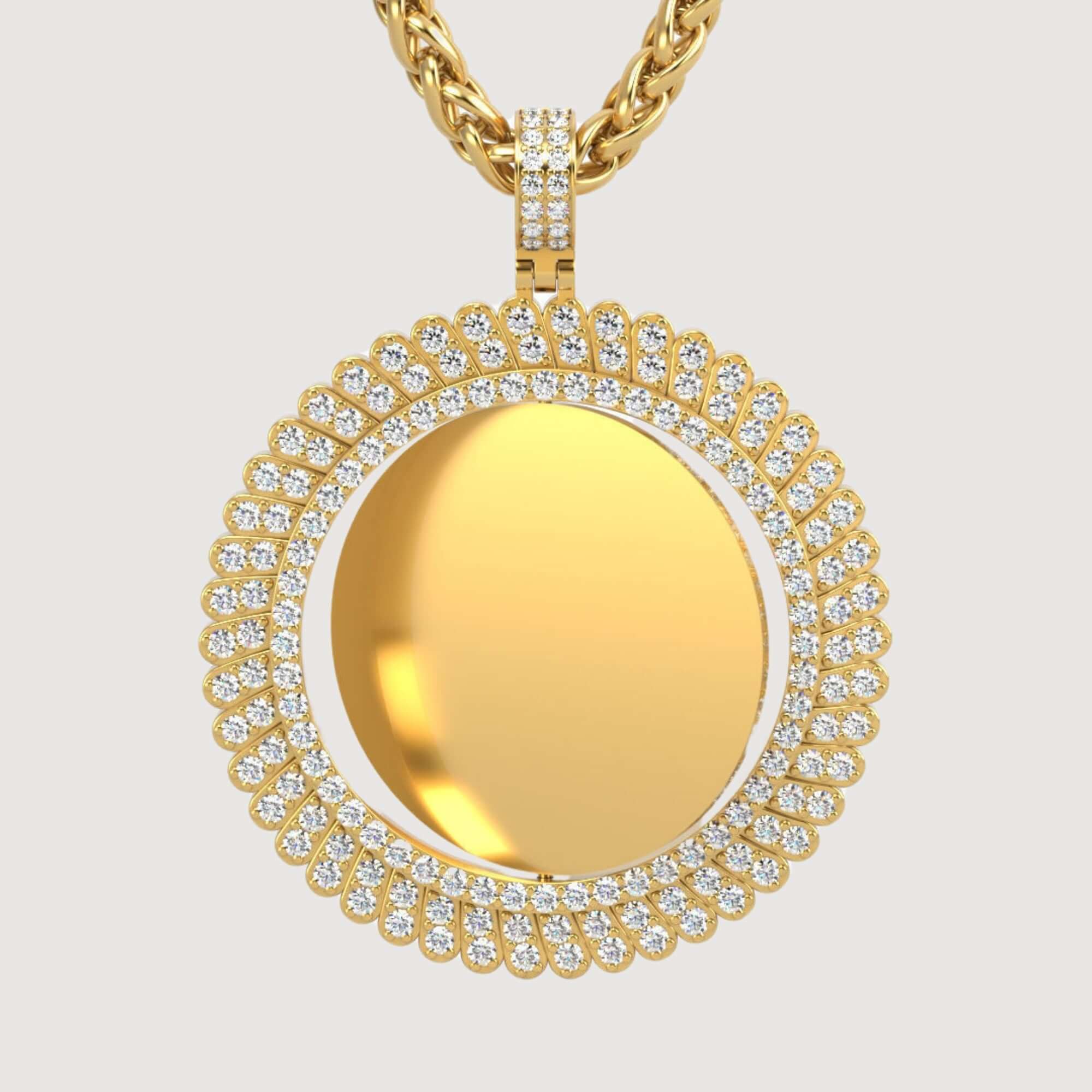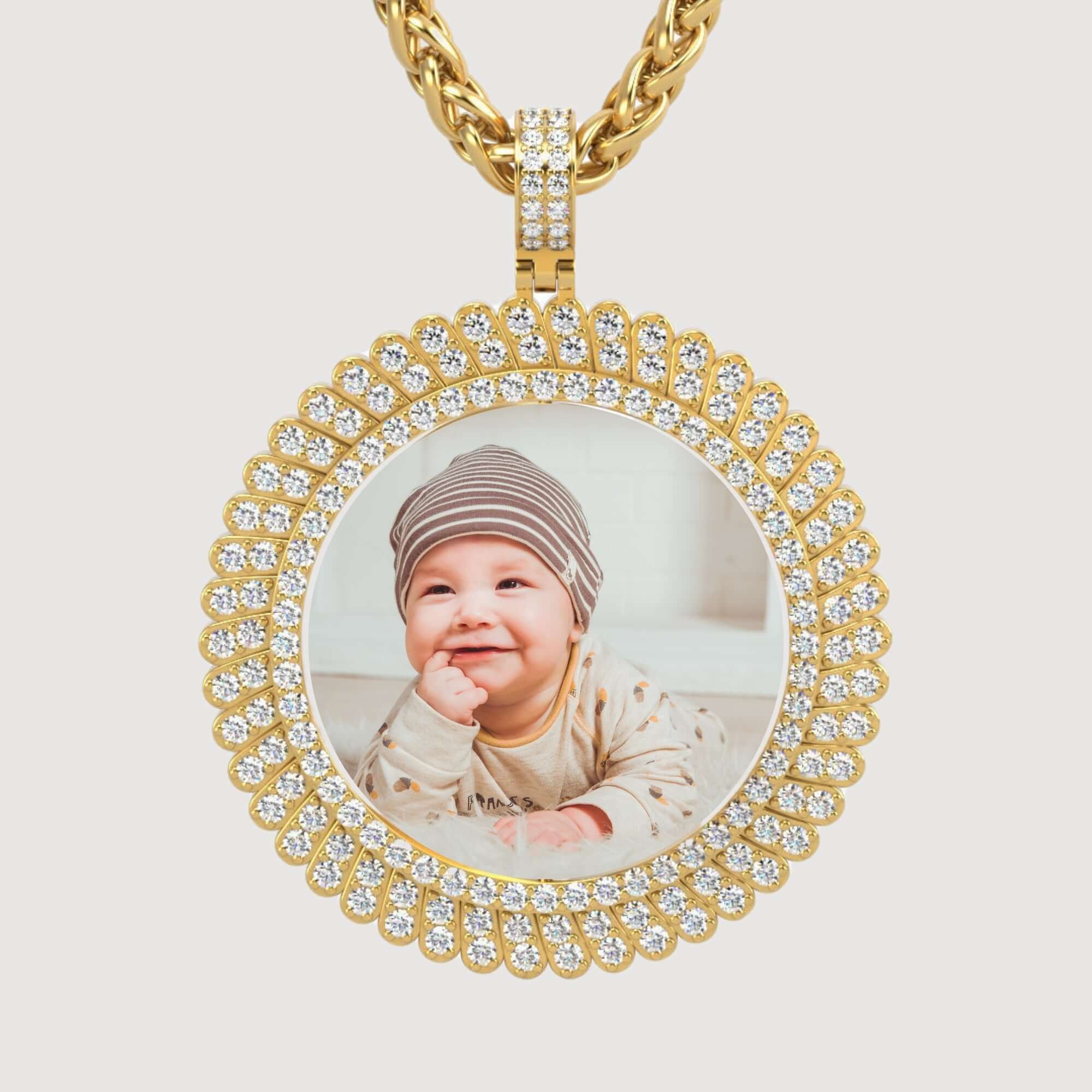 alt=" Crafted in 14K gold, this sunburst diamond round picture pendant features a dazzling halo design to showcase your cherished memories with timeless elegance. "