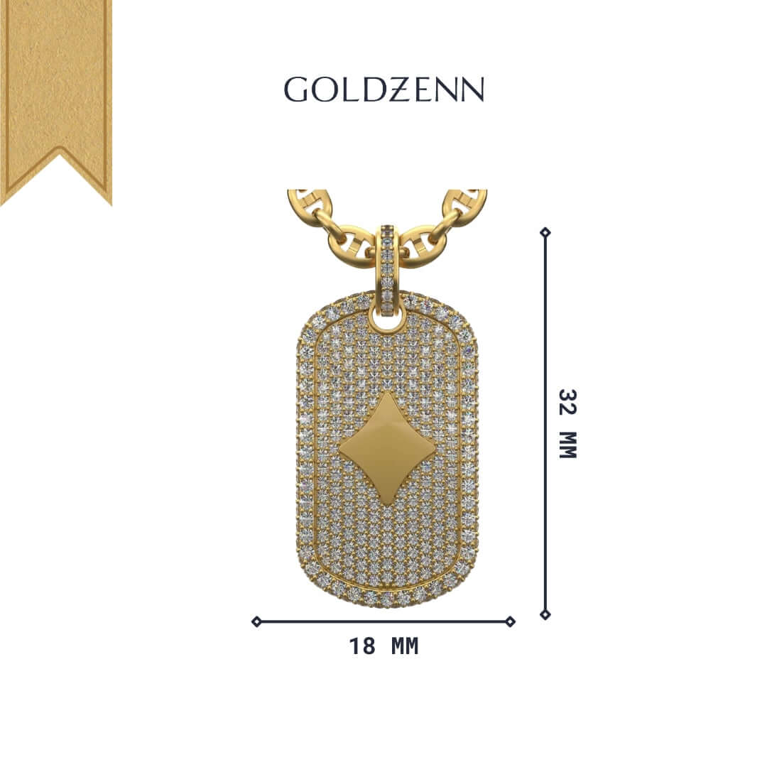 The 14K Gold Diamond Card Symbols Dog Tag Pendant is expertly crafted from solid 14K gold, providing superior durability and a radiant shine. Embellished with your choice of VVS1 Moissanite stones, VS1 G+ lab-grown diamonds, or G+ SI+ natural diamonds, this gold pendant offers exceptional quality and versatility. The bold design and premium materials make this military gold dog tag pendant a standout addition to any collection of men’s pendants.