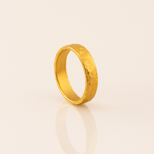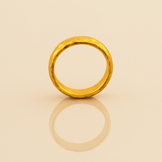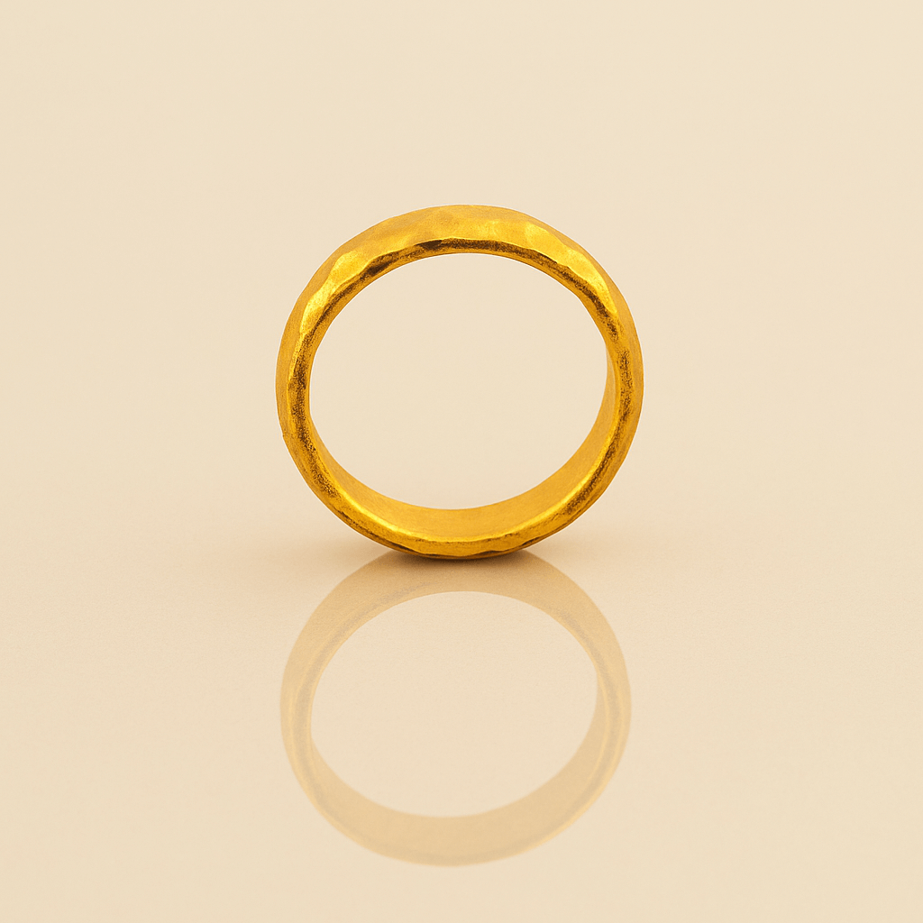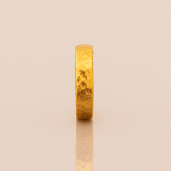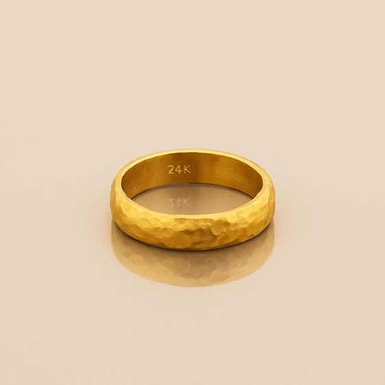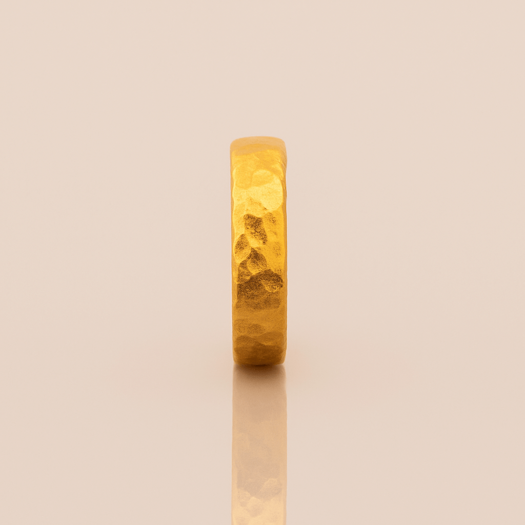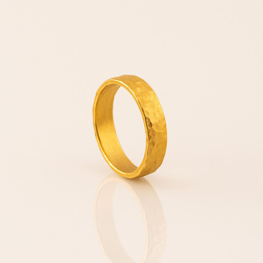 Alt="Discover this 4 mm hammered 24k gold band ring, featuring a hand-textured finish and comfort-fit interior. A timeless artisanal statement for everyday wear."