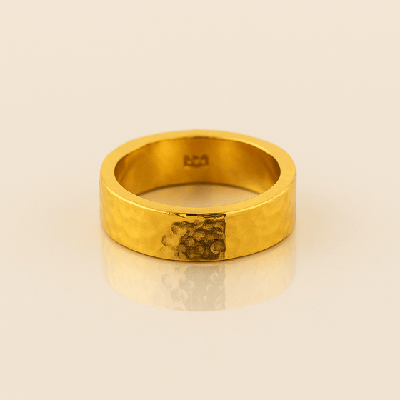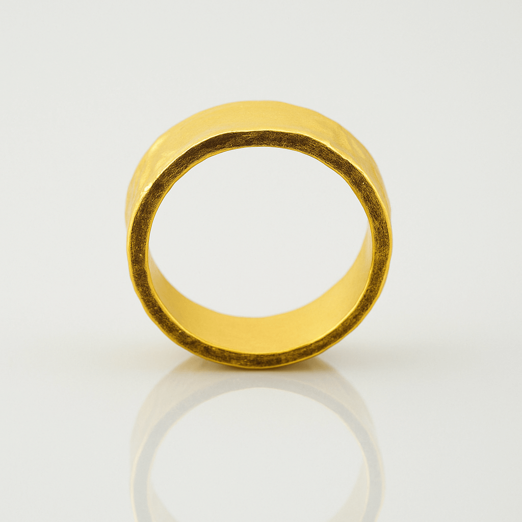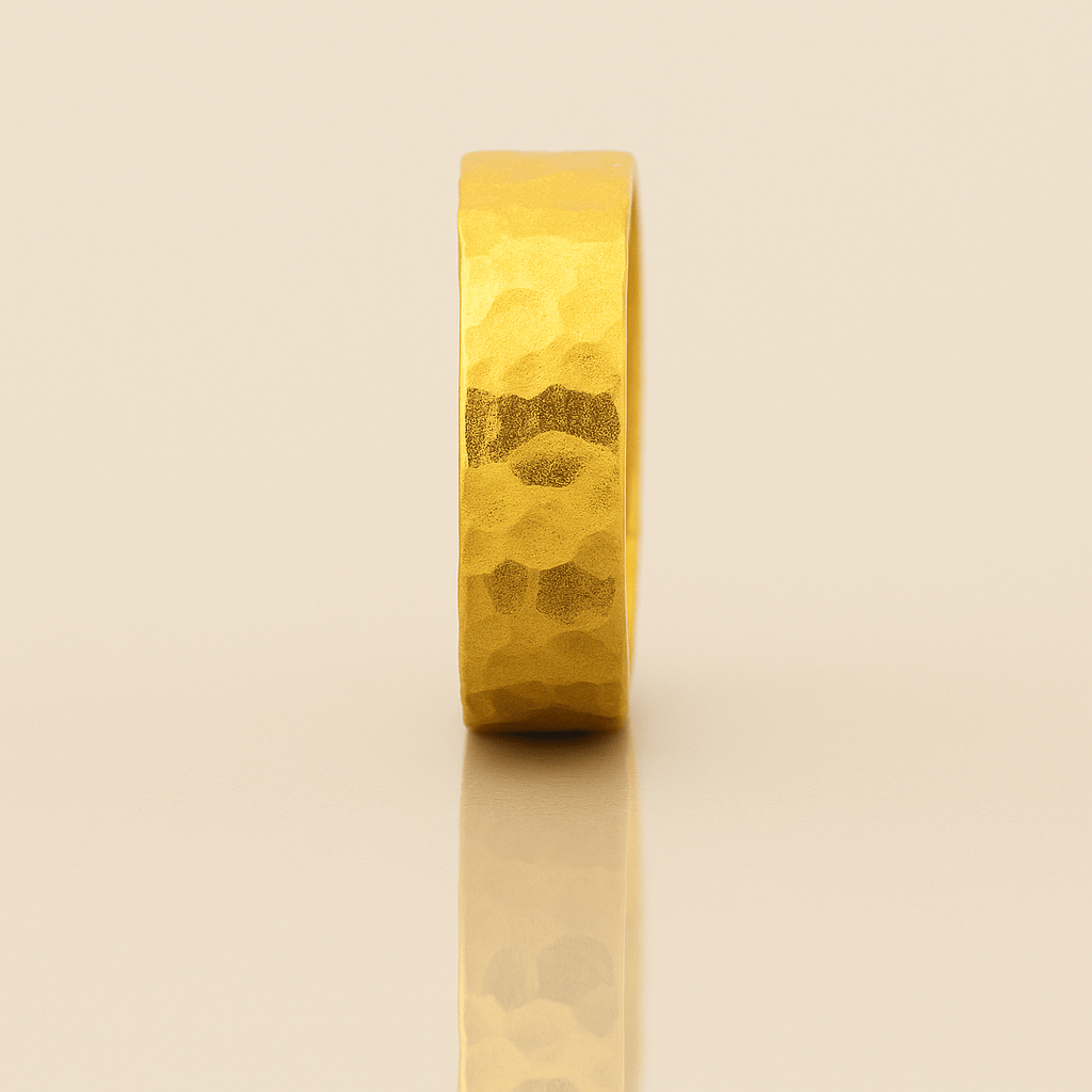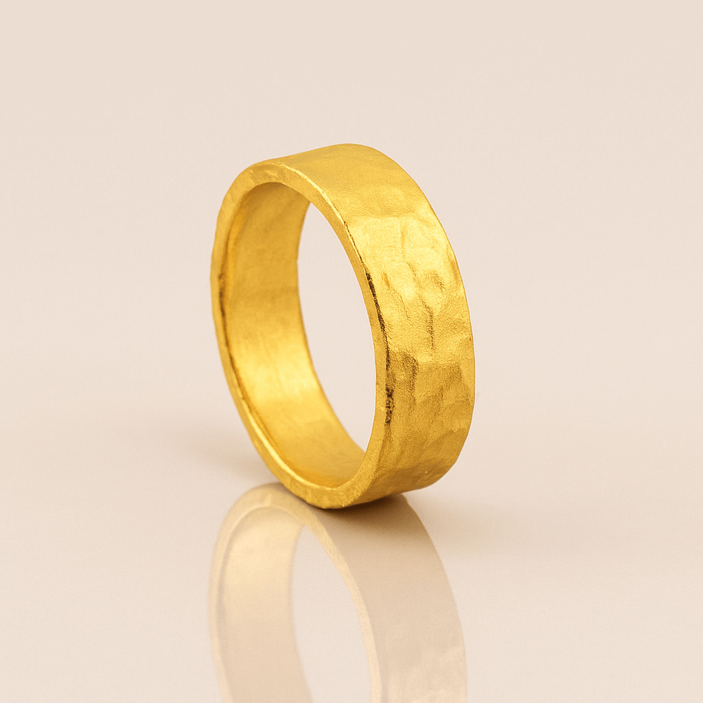Alt="Discover this 6 mm 24k gold hammered flat band with hand-textured finish and comfort-fit interior. Perfect for stacking or solo wear—shop the pure gold classic now!"