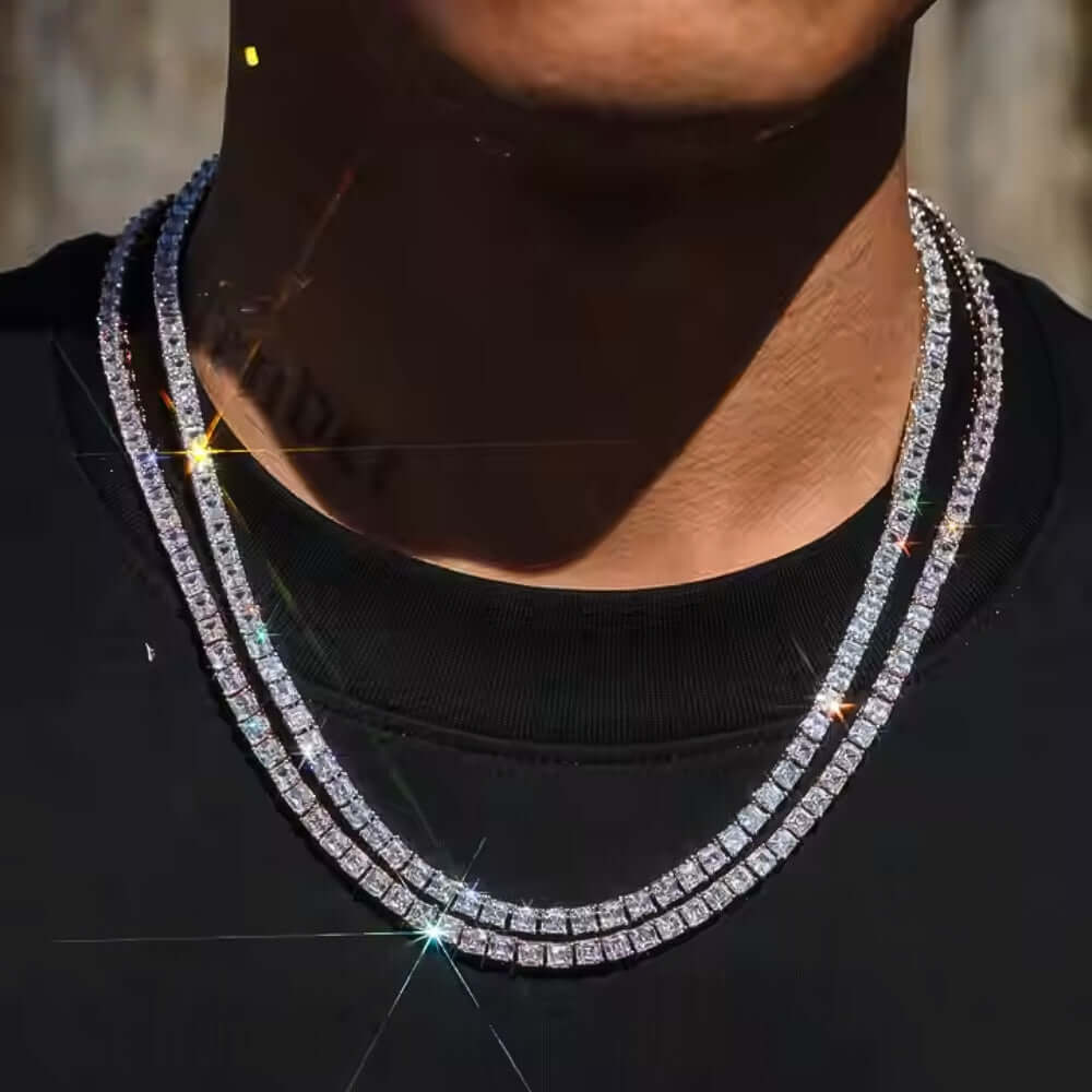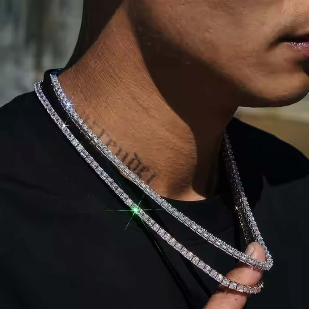 Alt="Crafted in 925 silver, GOLDZENN’s 4mm Tennis Chain features Asscher-cut moissanite. Hypoallergenic, tarnish-resistant & elegantly versatile."