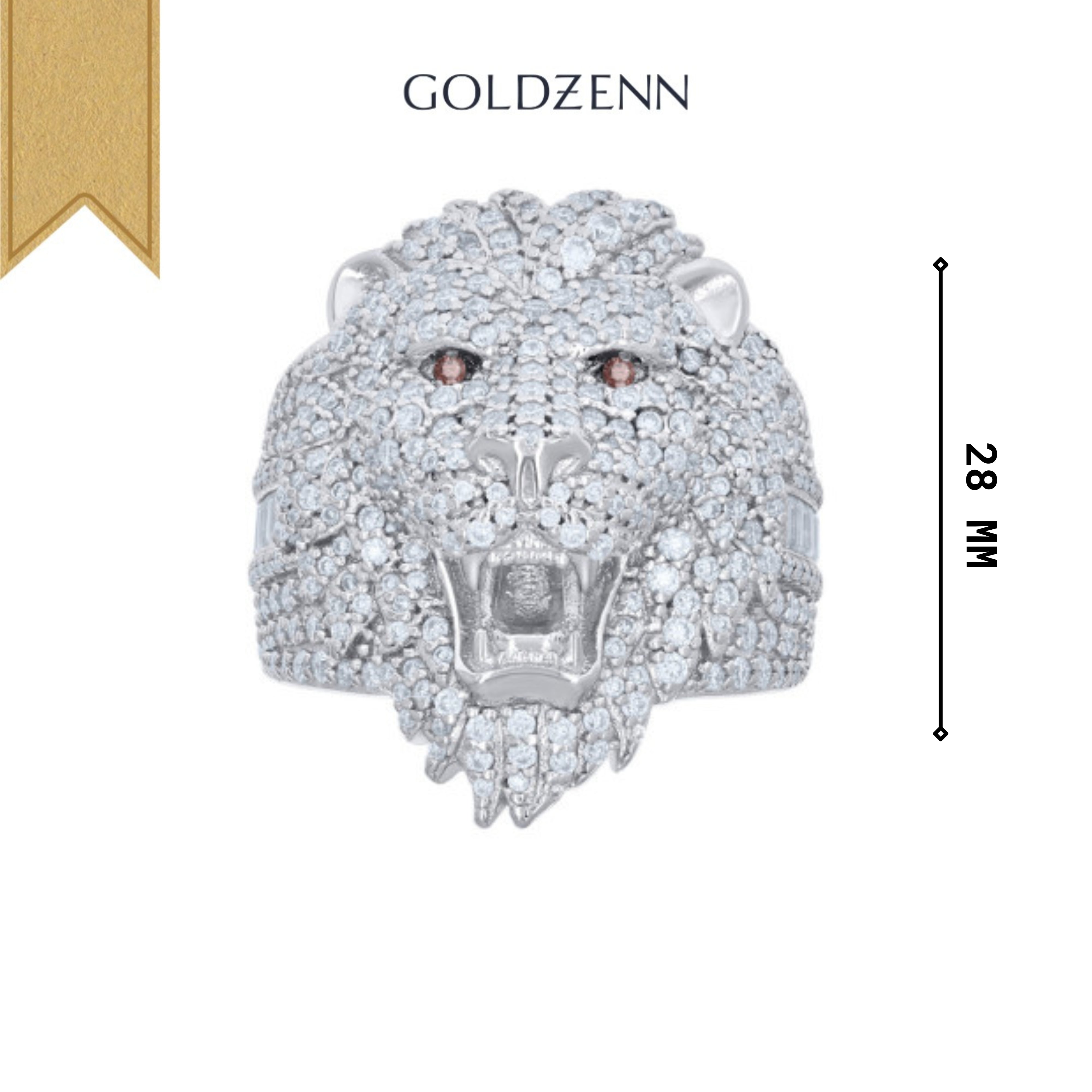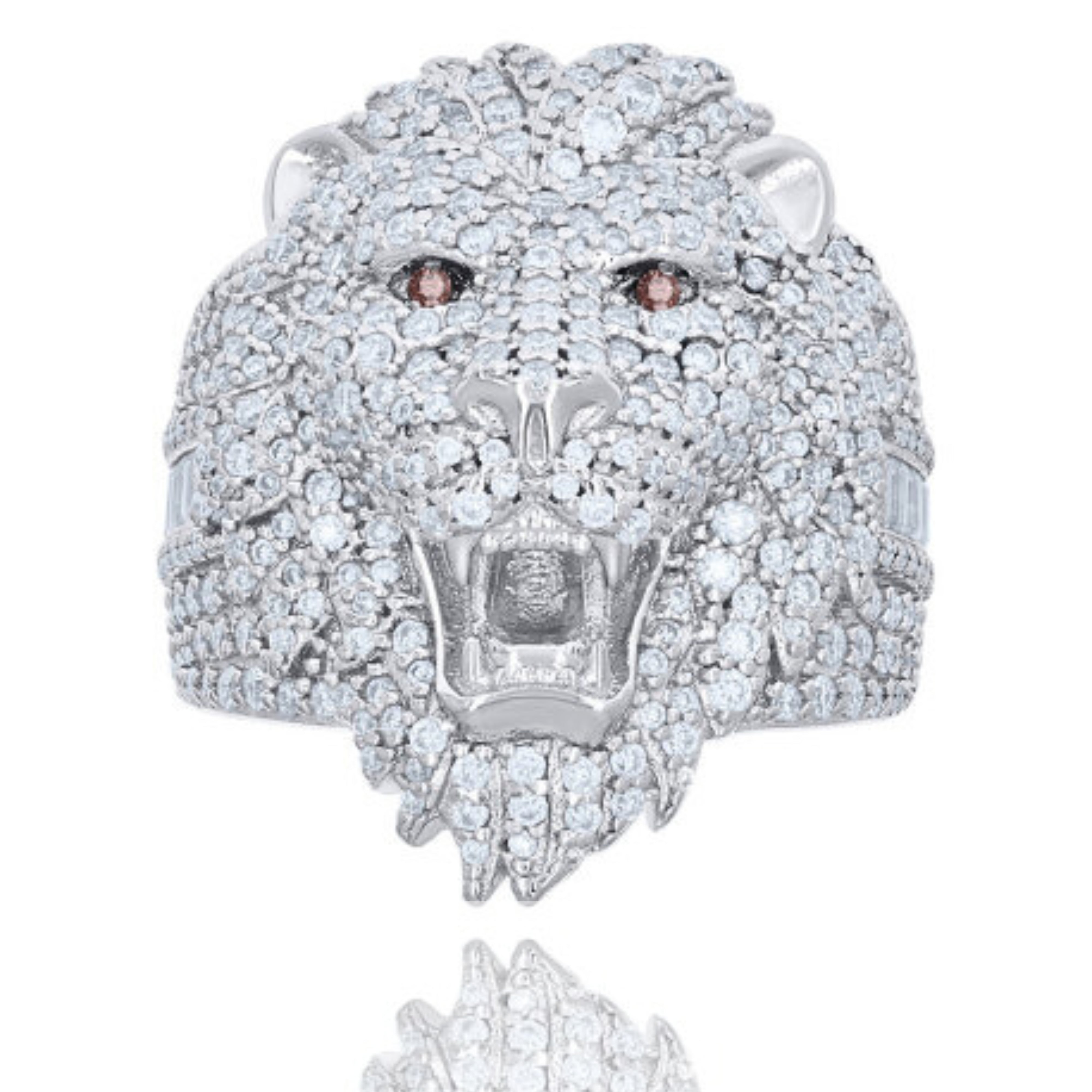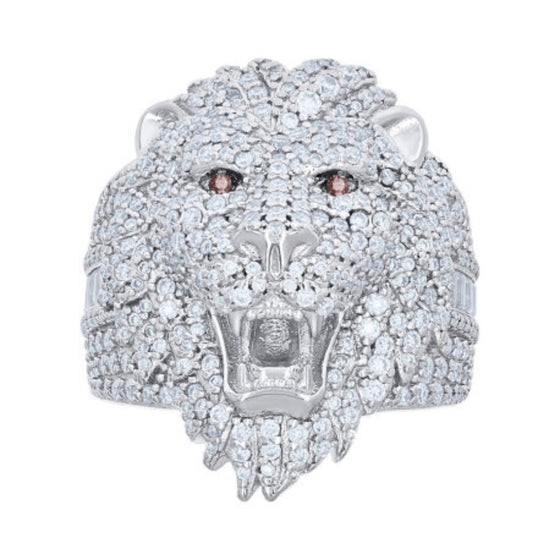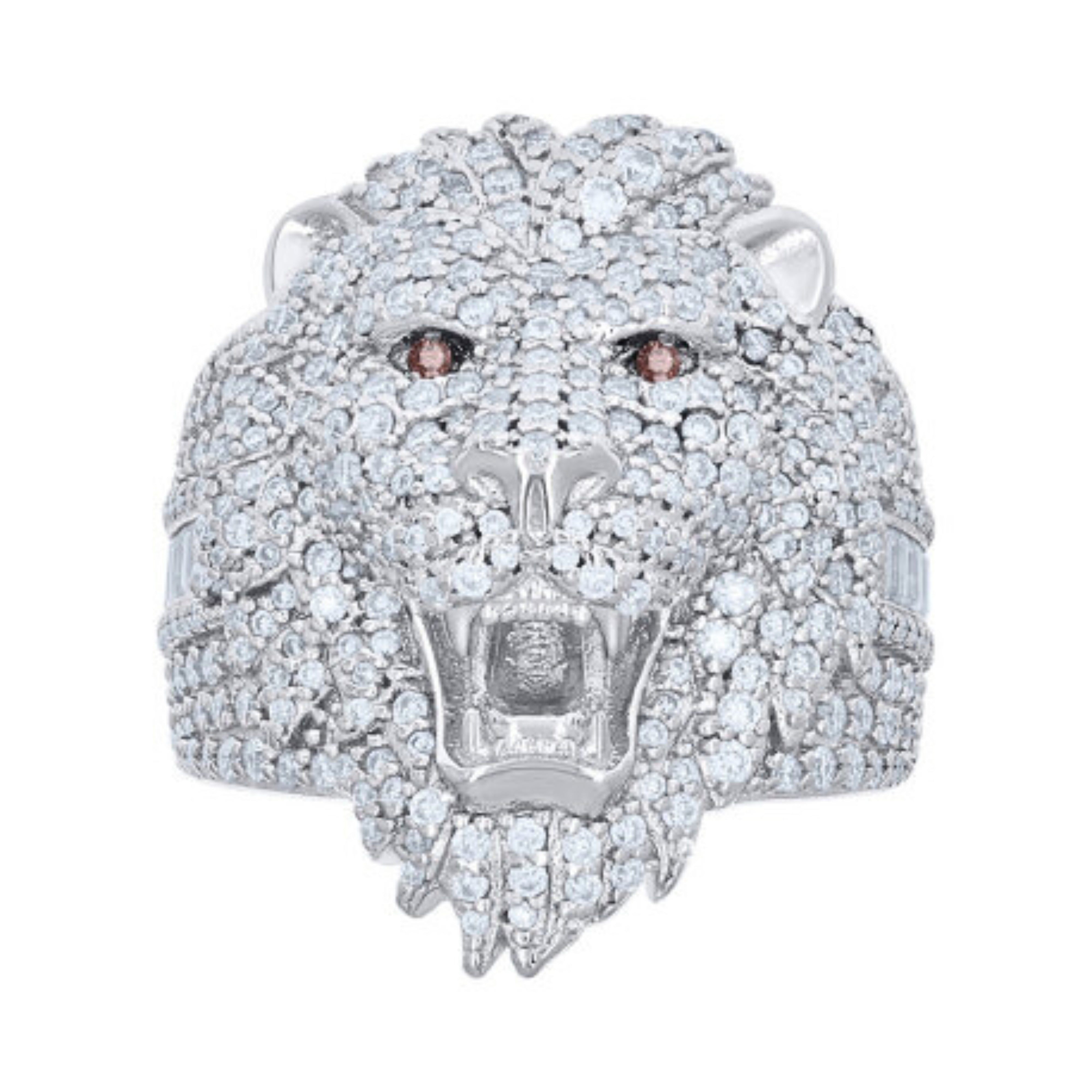 This ring showcases a detailed lion-head motif accented with 2.51 carats of round and baguette-cut moissanite stones along the mane and face. Mounted on a polished band, it combines fierce style with dazzling sparkle.