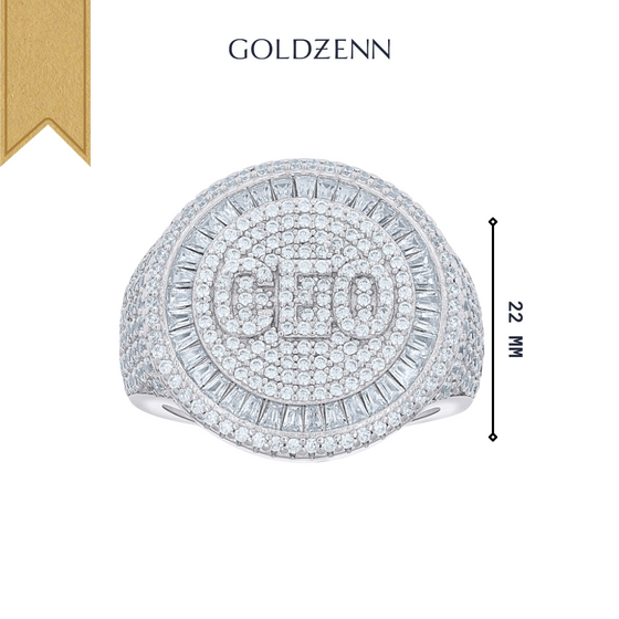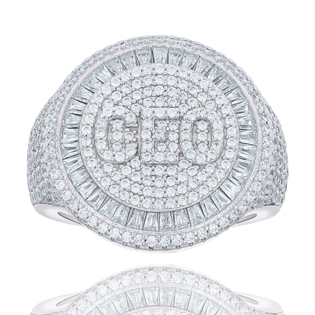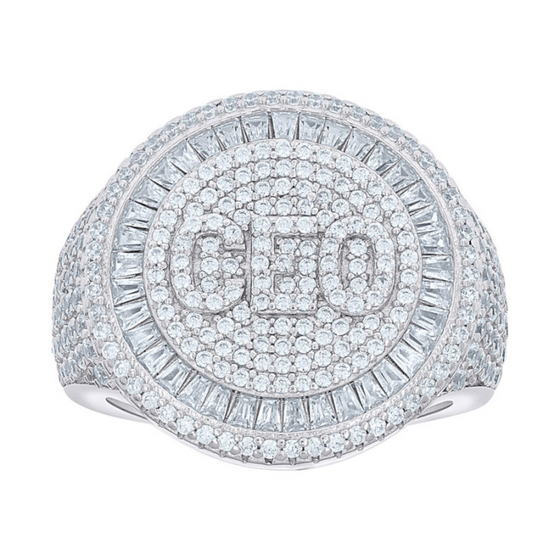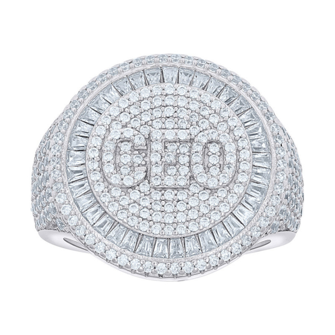 This fashion-forward ring showcases a round head pavé-set with baguette-cut moissanite stones and “CEO” engraving along the polished band. Its sleek finish and bold silhouette deliver an executive-level statement.