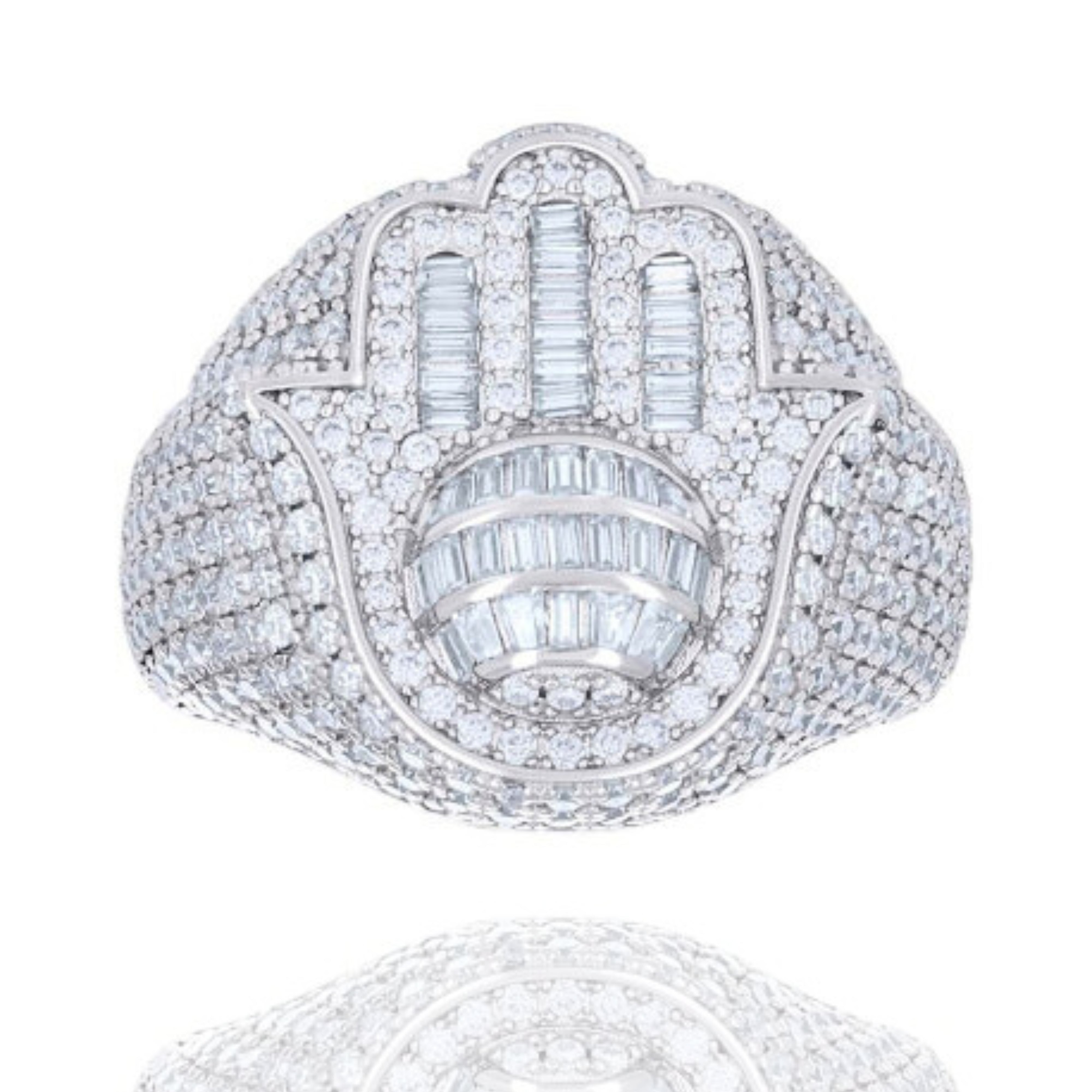 Embrace protection and style with our Baguette Moissanite Hamsa Symbol Religious Ring. Crafted from premium sterling silver, this ring showcases the Hamsa symbol—a revered emblem across various cultures symbolizing protection against the evil eye and bringing blessings and strength. The Hamsa design is intricately adorned with baguette-cut moissanite stones, known for their exceptional brilliance and clarity, adding a touch of modern elegance to this timeless symbol. Whether worn as a personal talisman or a meaningful gift, this silver moissanite ring offers a harmonious blend of spiritual significance and contemporary design.