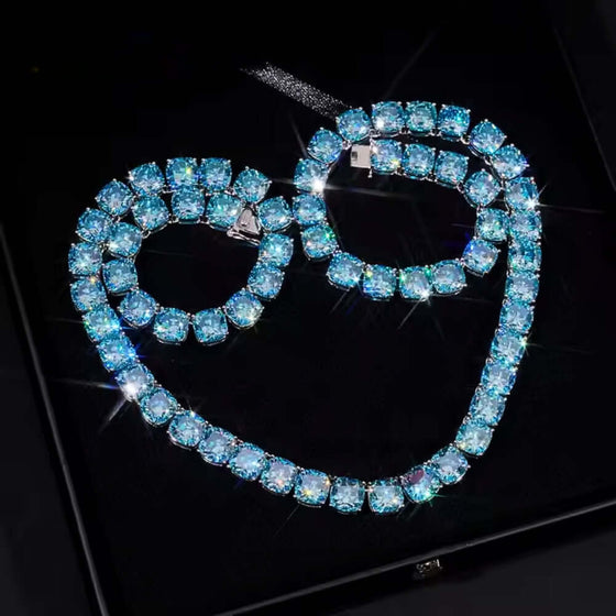 Looking for a tennis chain that exudes luxury and commands attention? Our 10mm Blue Moissanite Tennis Chain is designed to impress. This stunning piece is set with large, captivating blue moissanite stones, creating a bold and unforgettable look. The substantial 10mm width ensures maximum sparkle and presence, perfect for those who want to make a statement. Moissanite is renowned for its exceptional fire and brilliance, guaranteeing this piece will dazzle.