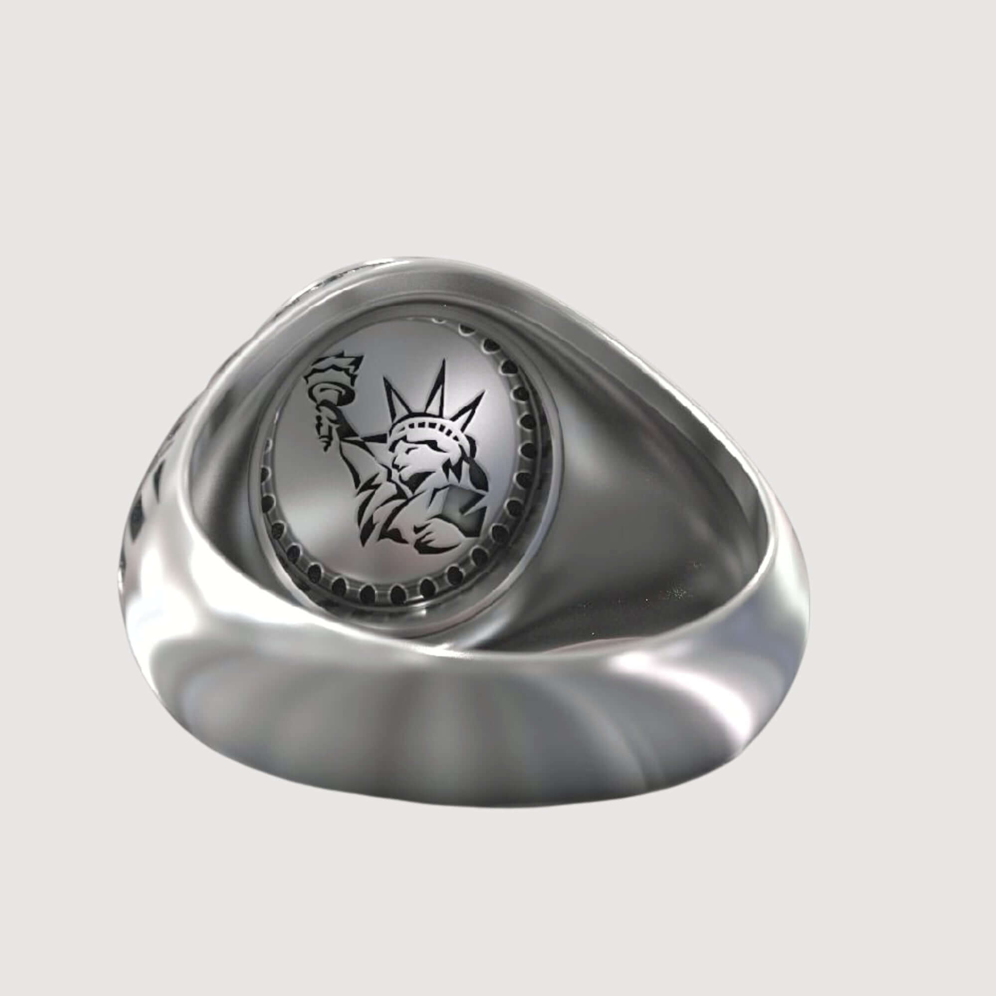 Make a patriotic statement with the Bold Eagle Liberty Statue Ring. This intricately designed solid gold ring showcases a striking eagle alongside the iconic Liberty Statue, symbolizing freedom and strength. Crafted with precision, the polished band enhances the bold and detailed motifs, making it a standout accessory. Perfect as a men’s gold ring, this piece combines heritage with modern craftsmanship, ideal for everyday wear or as a unique addition to any collection.