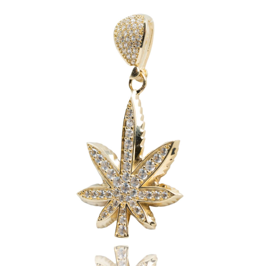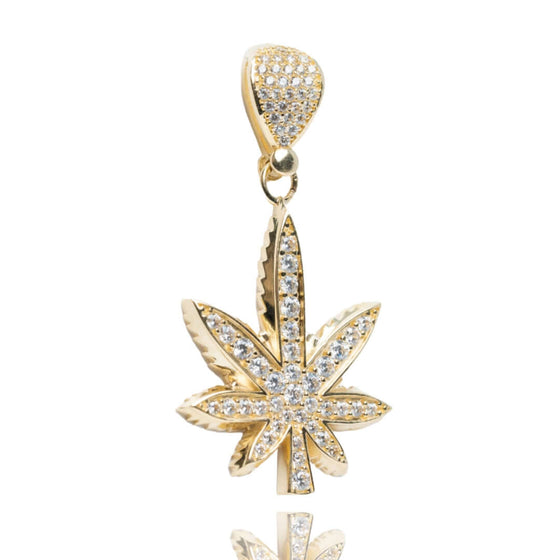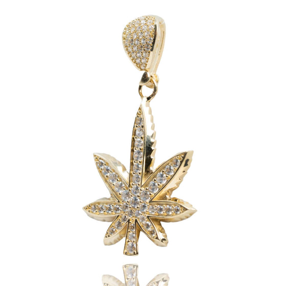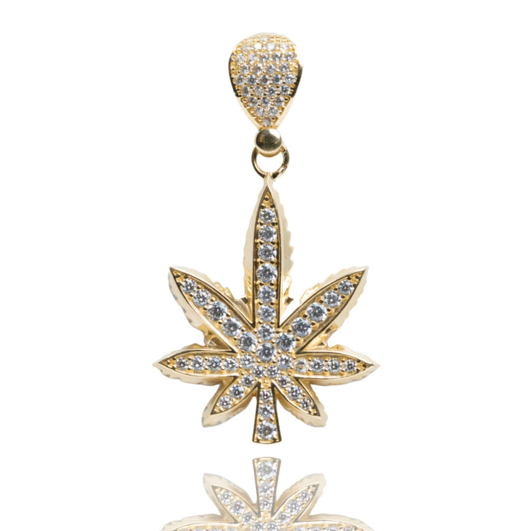 Alt="Make a statement with a 14K Gold Cannabis Pendant. 30mm, CZ stones, engraved mantra & insured 2-day FedEx shipping. For bold, unapologetic style."