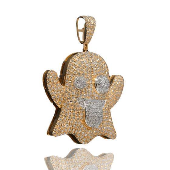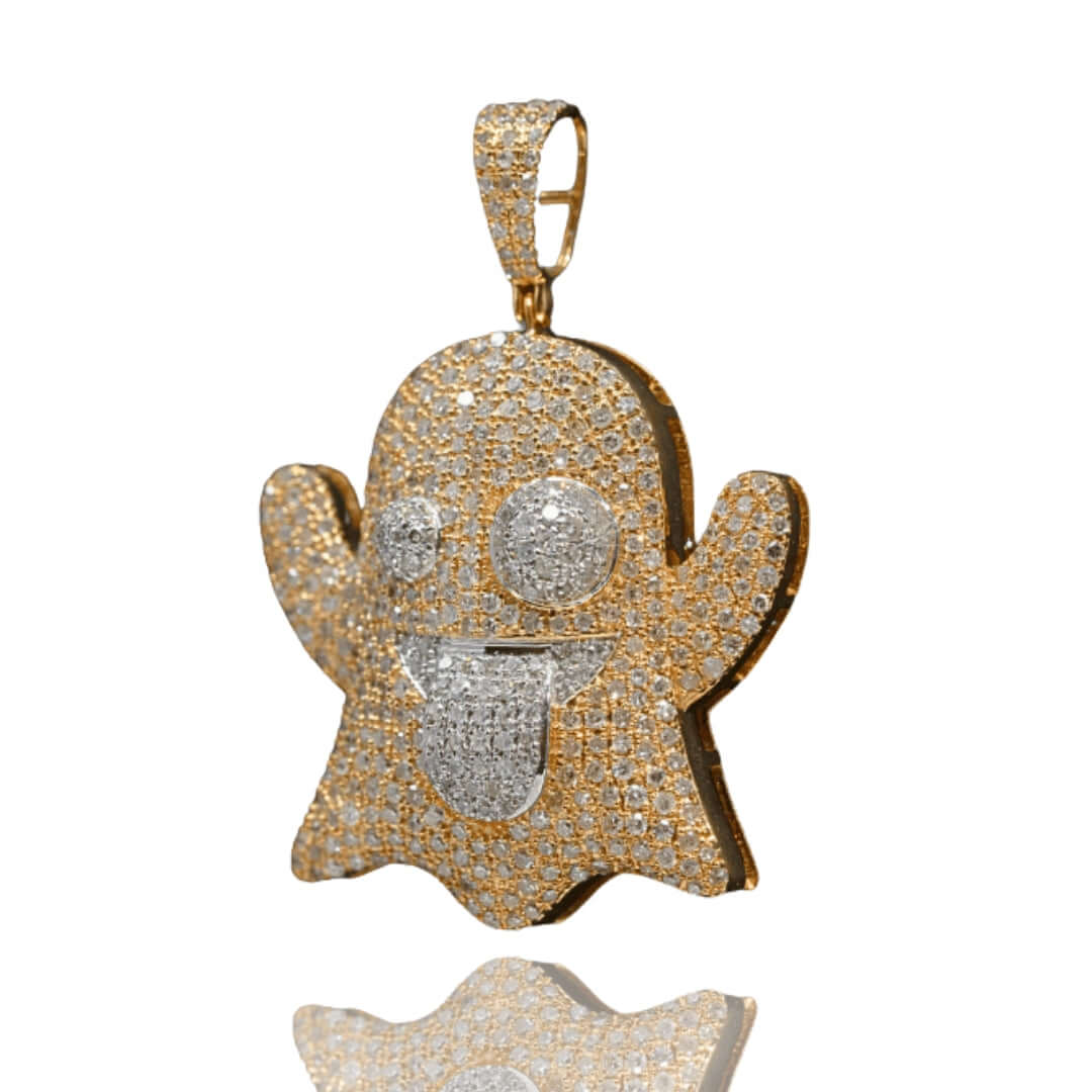 Unleash your playful side with the 1.18 CTW Diamond Ghost Pendant in 14k Gold. This Cartoonish yet luxurious pendant features a ghost emoji design brought to life with 1.18 carats of dazzling diamonds. The diamonds are meticulously arranged to highlight the ghostly silhouette, while the 14k gold base adds a warm and timeless touch. Perfect for adding a fun yet sophisticated edge to your jewelry collection, this diamond gold pendant transitions effortlessly from casual wear to standout statement. Make every look enchanting with this one-of-a-kind design.