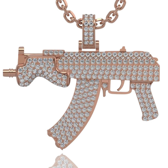Alt=" Discover the 14K Gold Diamond Mini Draco Gun Pendant. A bold and luxurious men’s gold pendant, featuring a mini Draco gun design with dazzling diamonds."