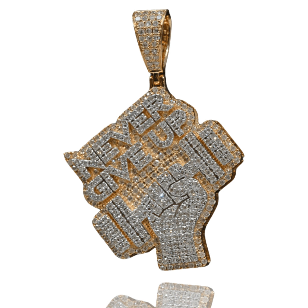 Embrace resilience and determination with this 1.09 CTW Diamond "Never Give Up" Pendant in 14K Yellow Gold. Featuring an empowering design, this pendant is adorned with a bold fist symbol and the inspiring words "Never Give Up" encrusted with 1.09 carats of sparkling natural diamonds. The intricate detailing is amplified by the warmth of 14K yellow gold, offering a striking blend of brilliance and strength.