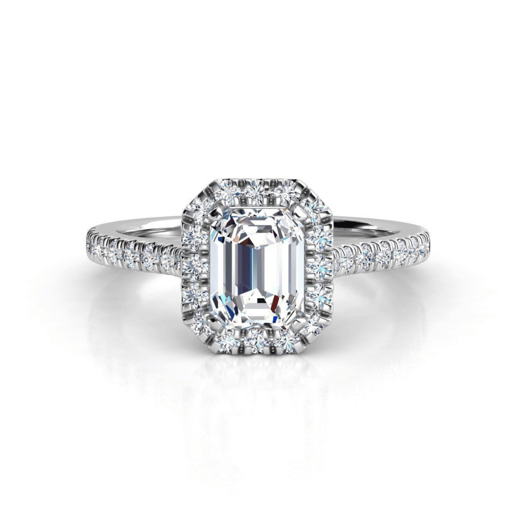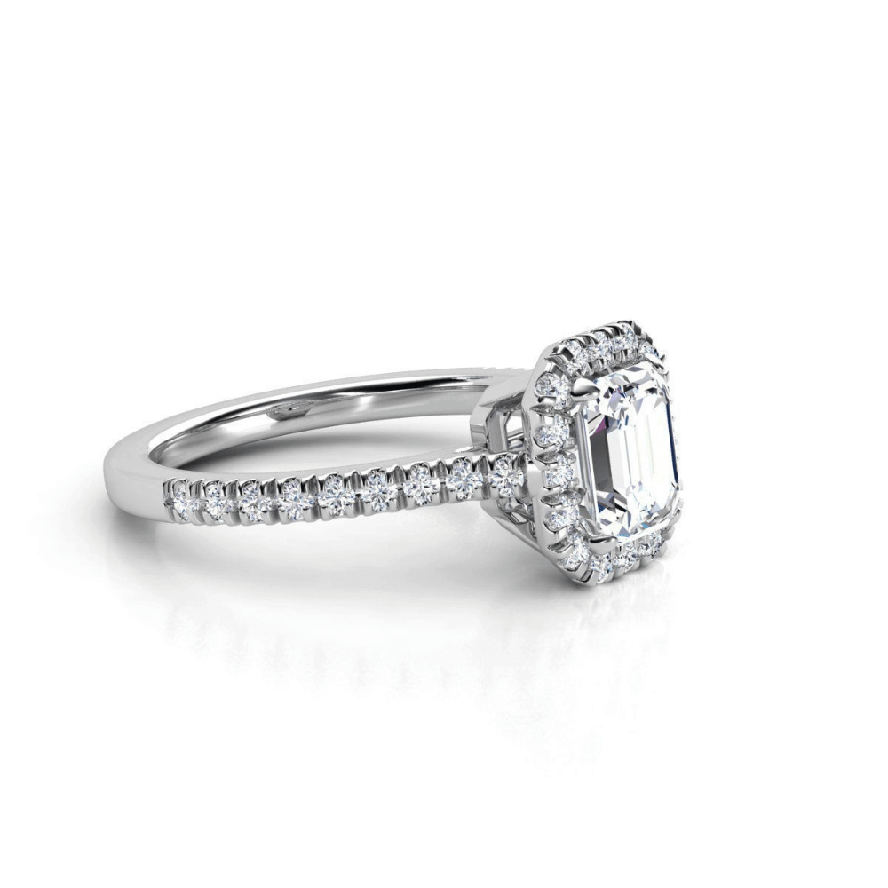 alt=" Discover timeless elegance with the Emerald-Cut Halo Diamond Engagement Ring. Features a radiant emerald-cut diamond, pavé halo, and band for a dazzling design. "