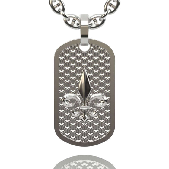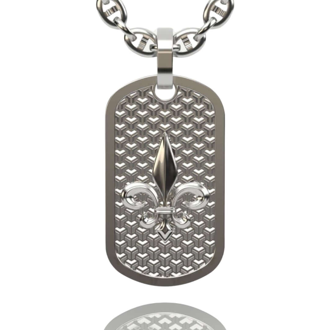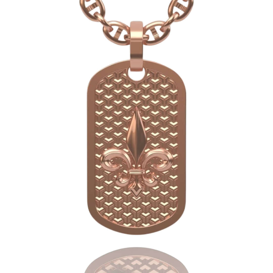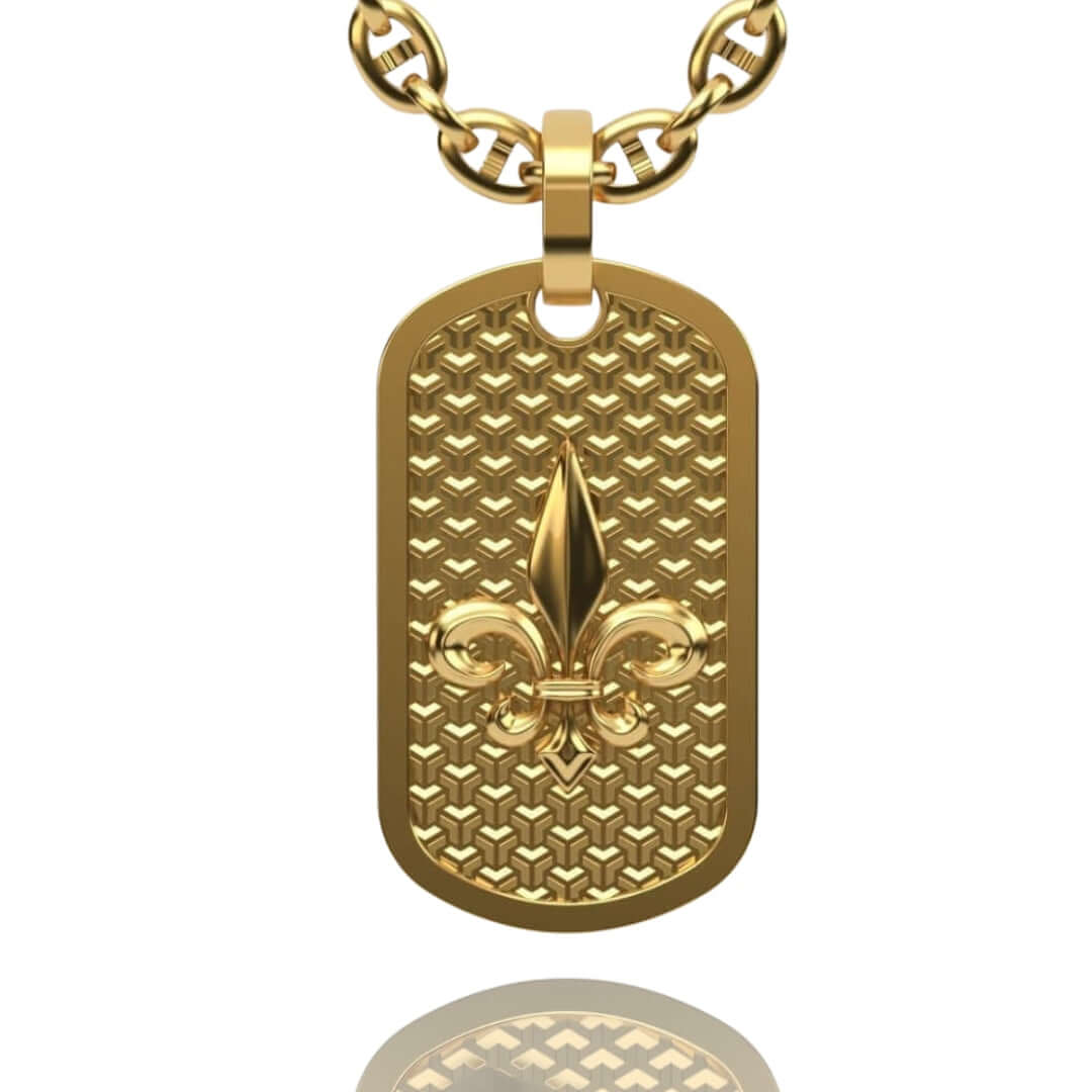 Alt="Discover the 14K Gold Fleur De Lis Dog Tag Pendant. A luxurious men’s gold pendant featuring a timeless Fleur De Lis design, blending style and sophistication."