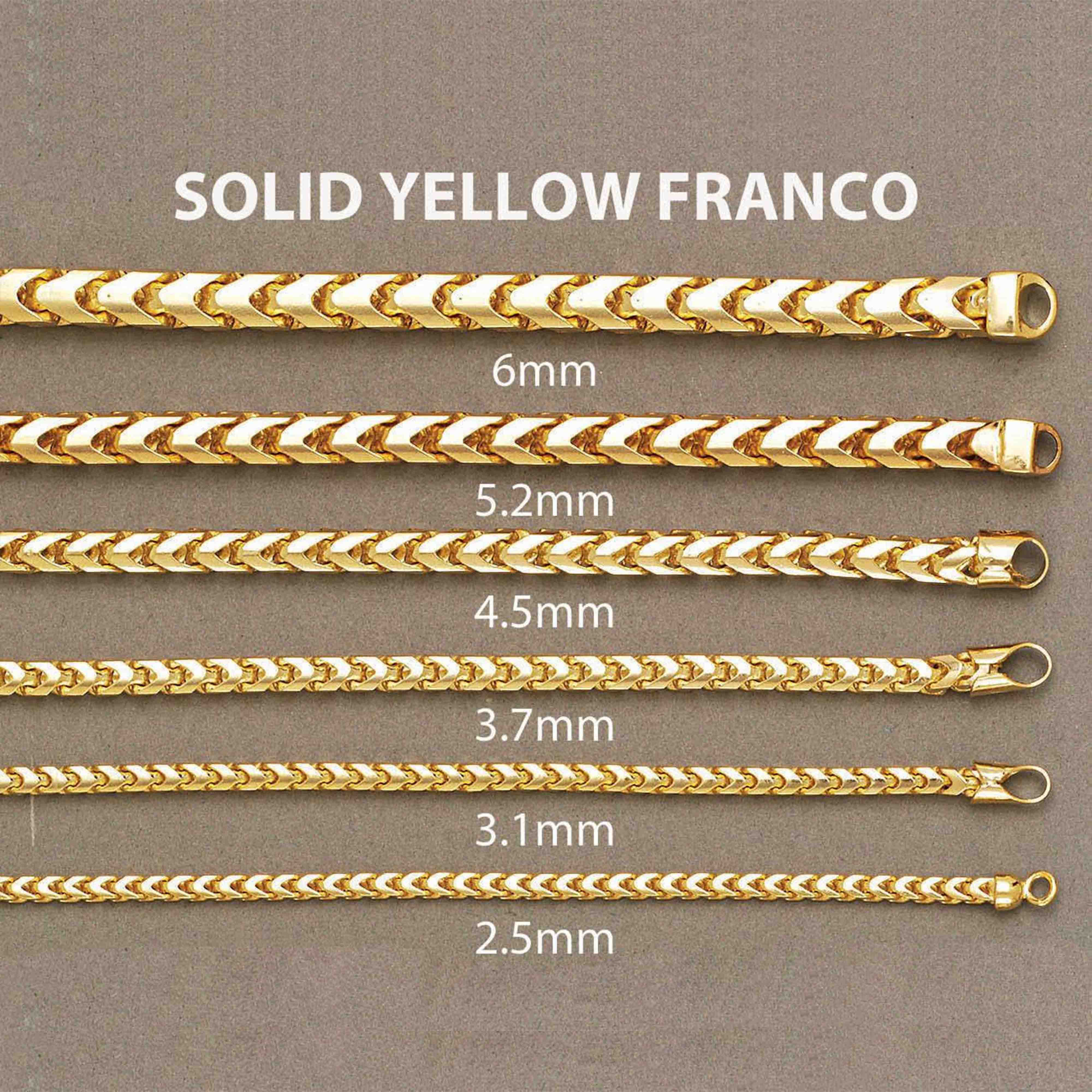 alt=" Shop Yellow Gold Franco Chains 1.8-6.5mm. Timeless style & solid gold quality in versatile widths. Perfect for any look. "