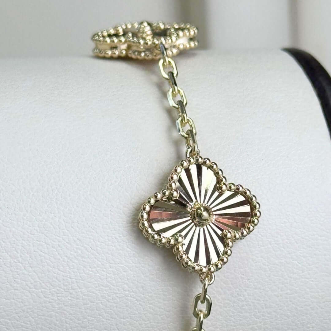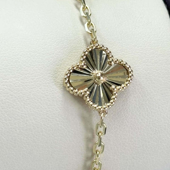 Alt="Embrace fivefold luck with our 5 Leaf Clover Bracelet in 14k yellow gold. Features five delicate clover charms on a slender chain for timeless style."