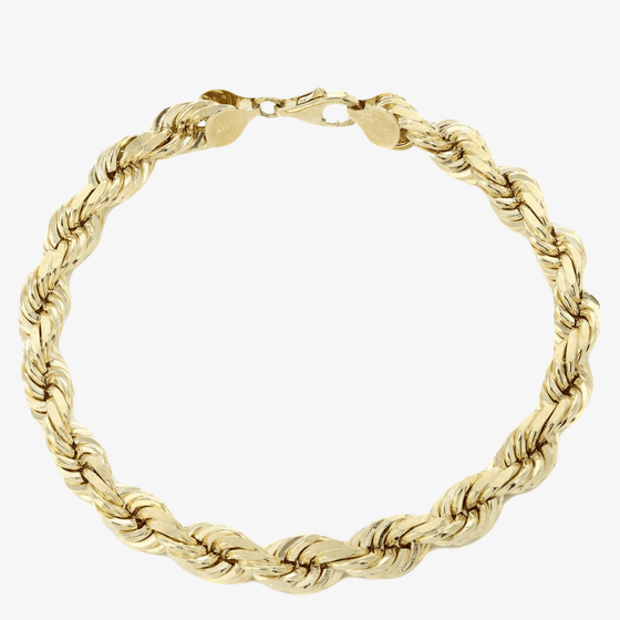 Alt=" 8mm solid gold rope bracelet in 10k or 14k. Heavyweight gold with major shine. For the boldest wrists. Available in 7" to 9"."