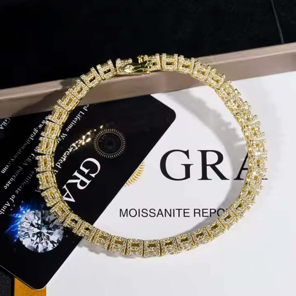 Alt=" Iced Out Moissanite Tennis Bracelet - 5mm Shop the 5mm Iced Out Moissanite Tennis Bracelet at Goldzenn, featuring brilliant moissanite stones set in 925 sterling silver. Fully iced out luxury wristwear."