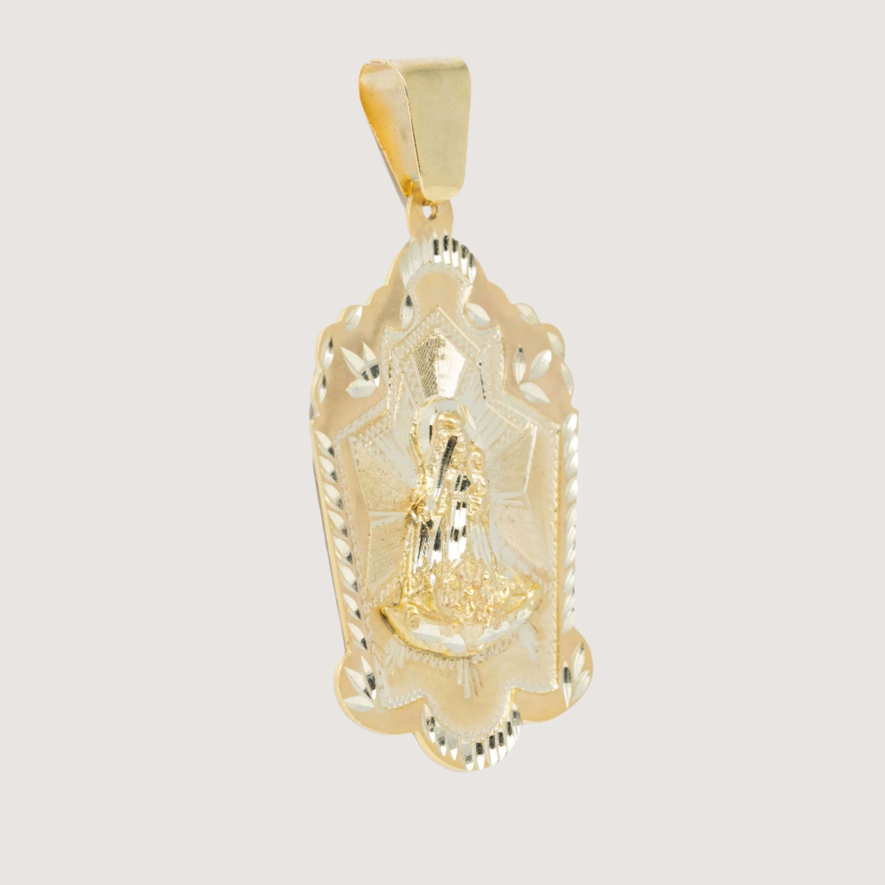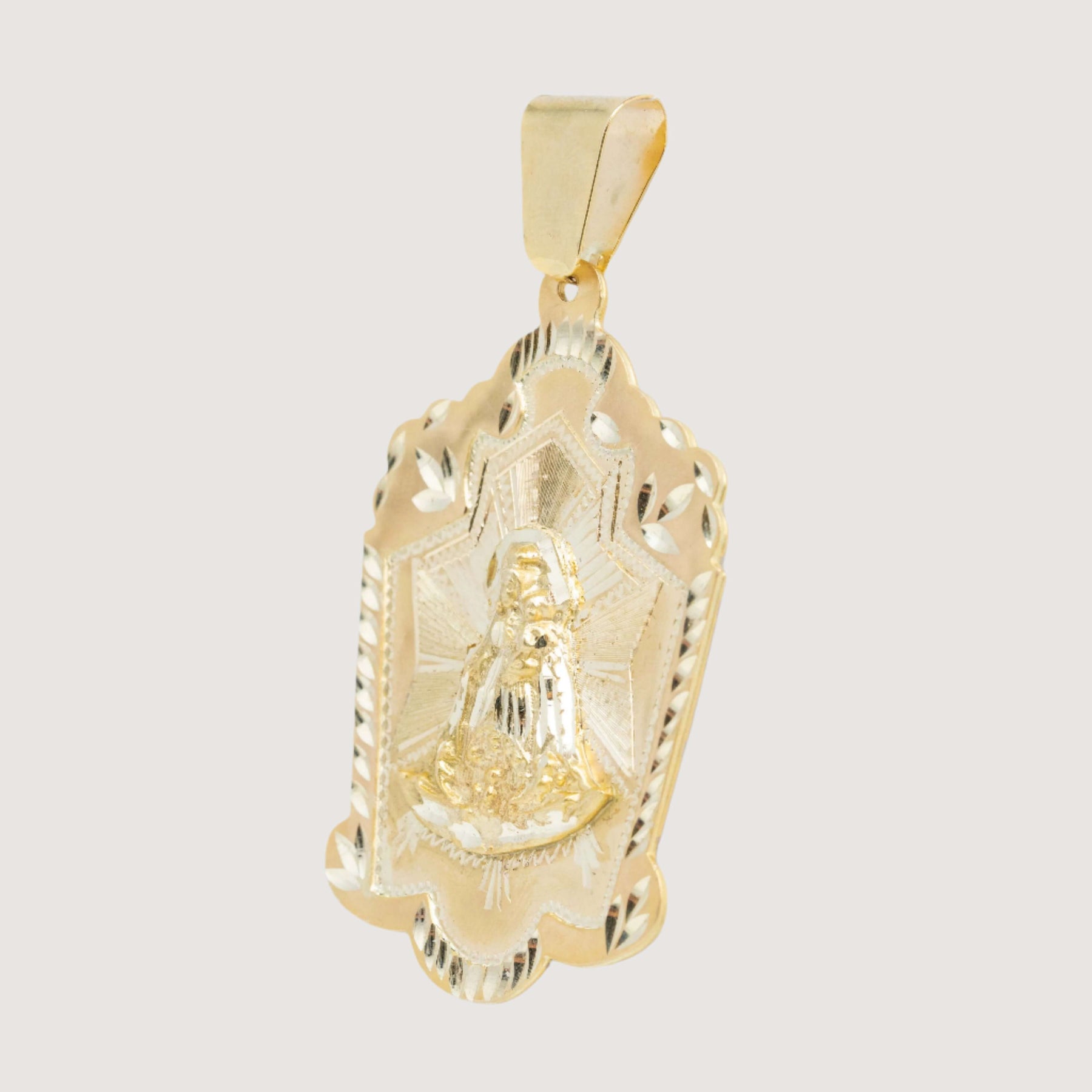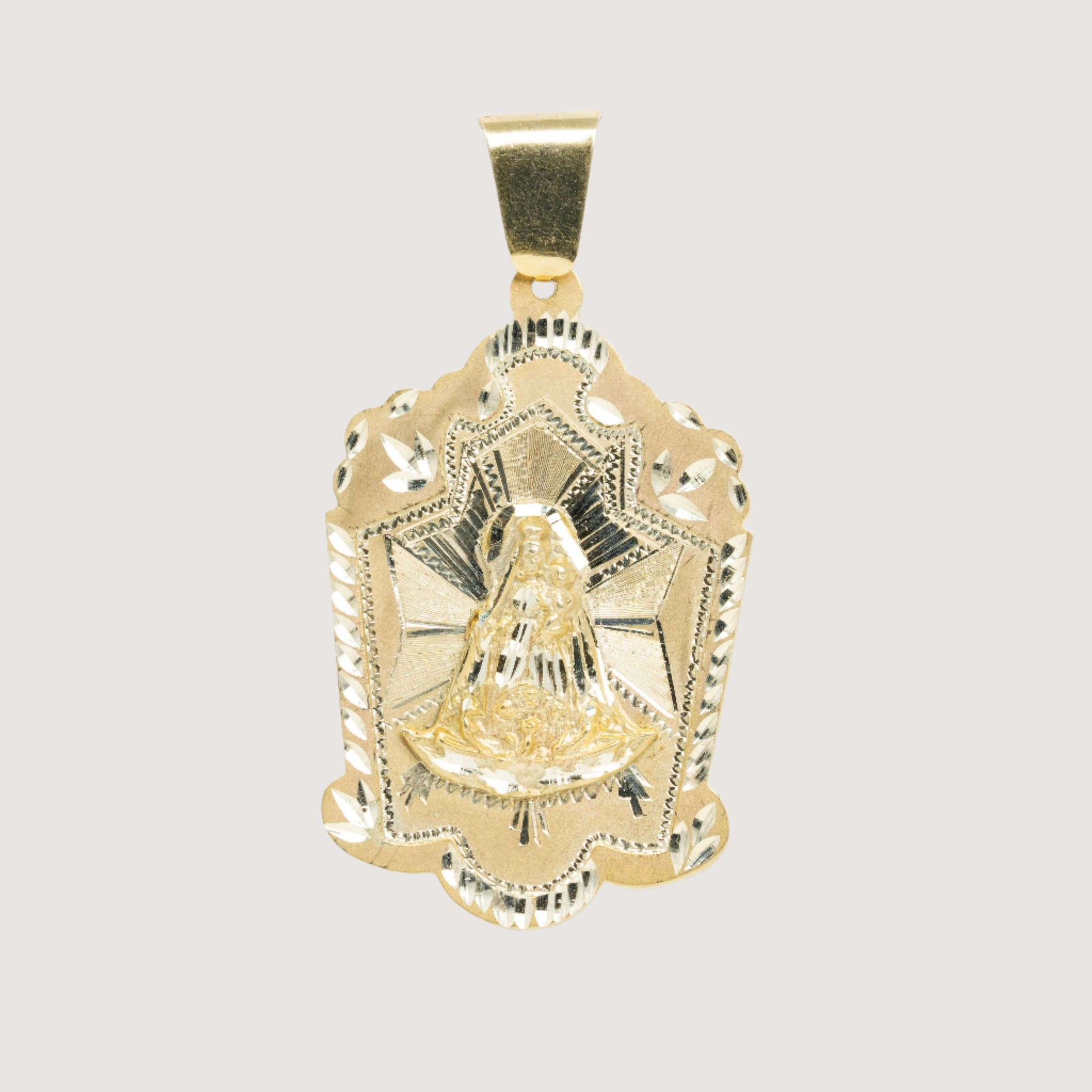 Alt="Embrace elegance and protection with our 10k solid gold Lady Charity Caridad del Cobre pendant—perfect for spiritual strength and style."