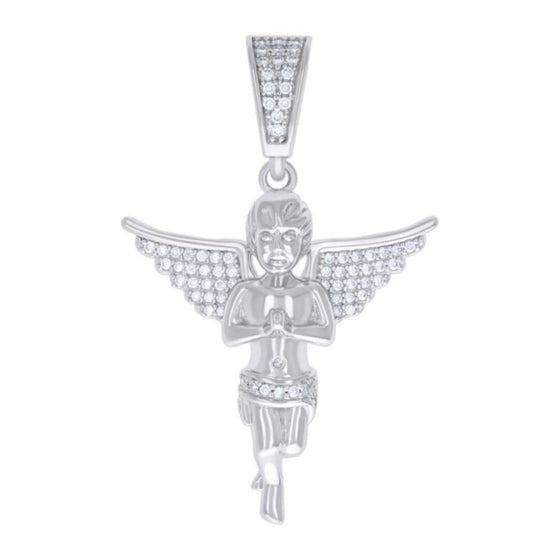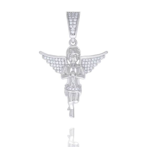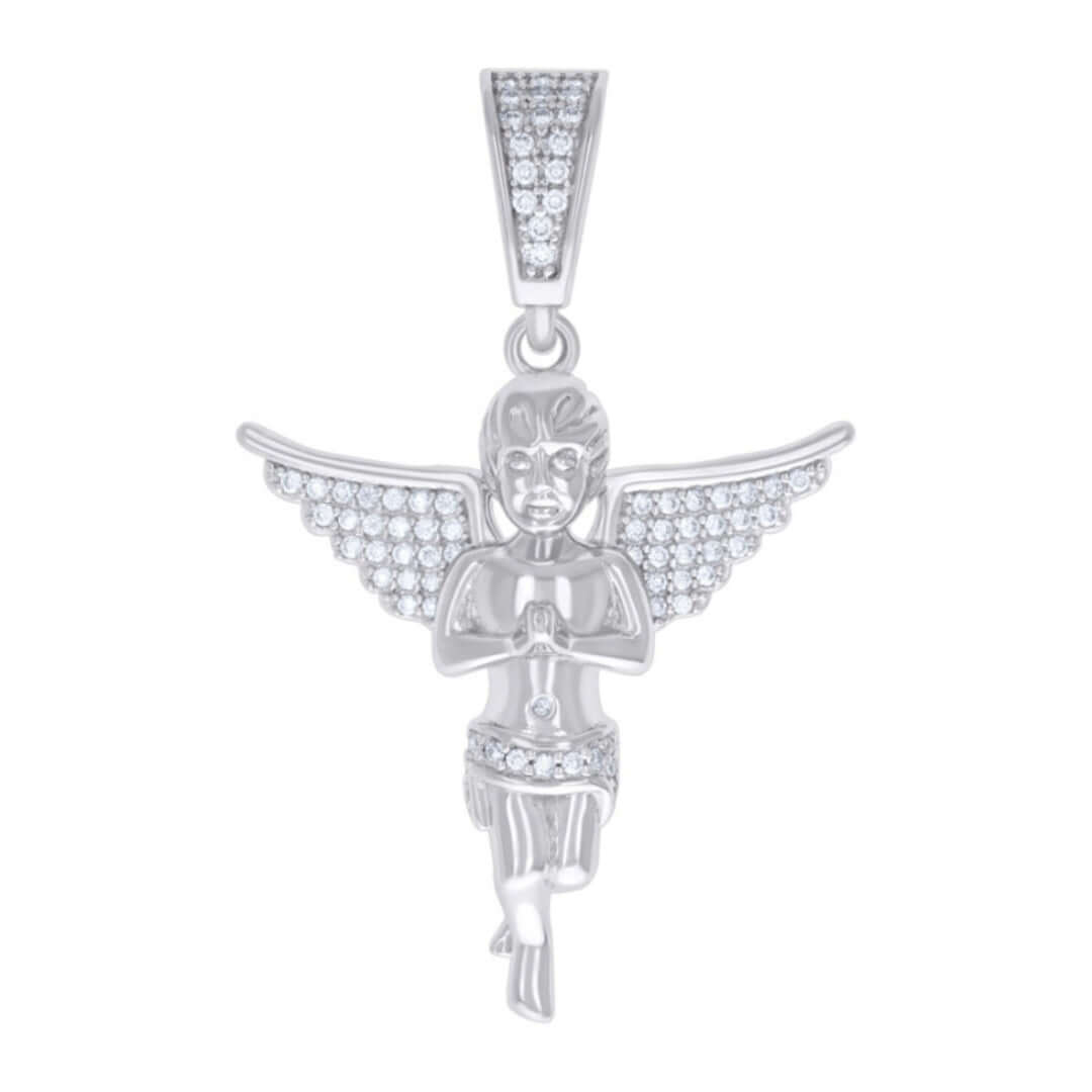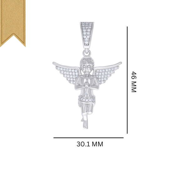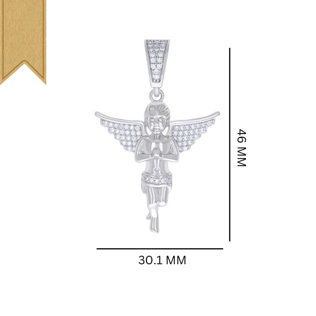 Alt="Crafted in 925 silver with VVS D-color moissanites, this angel pendant embodies divine elegance and modern craftsmanship. Shop at GOLDZENN."