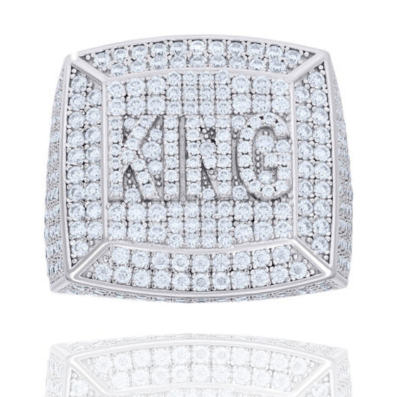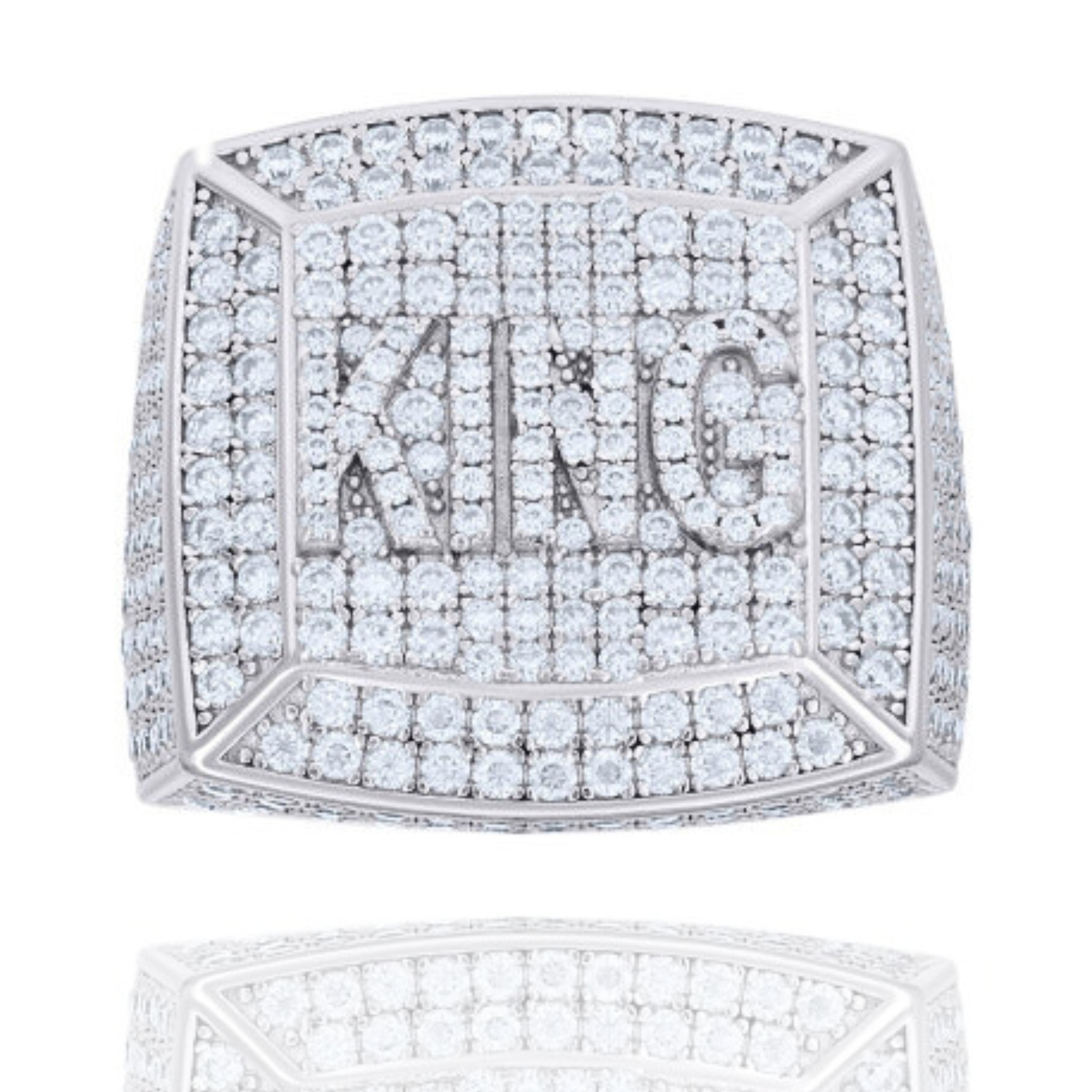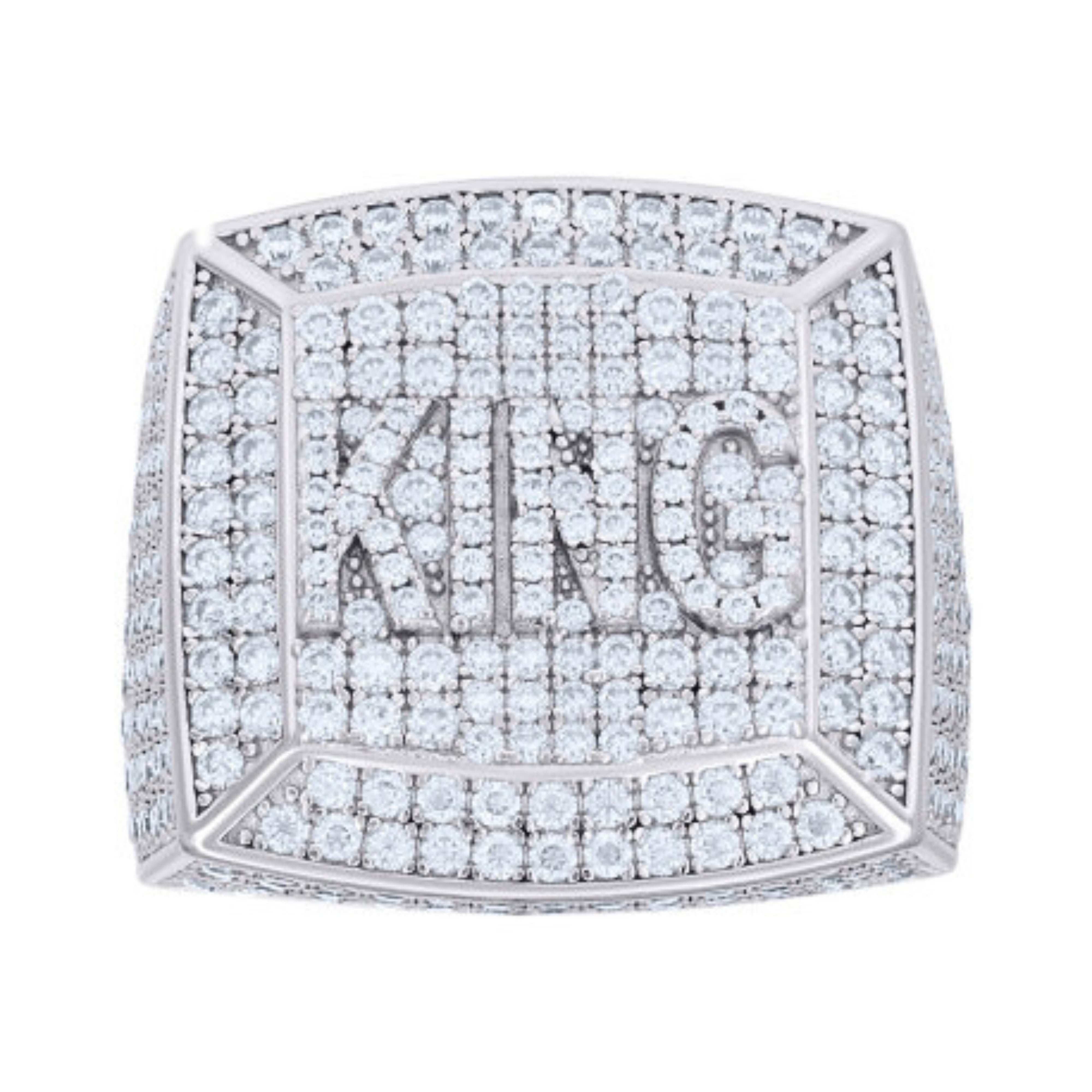 This fashion-forward ring features a bold square head fully pavé-set with brilliant-cut moissanite stones and “KING” engraving along the band. Its high-polish finish and geometric silhouette deliver a modern, regal statement.