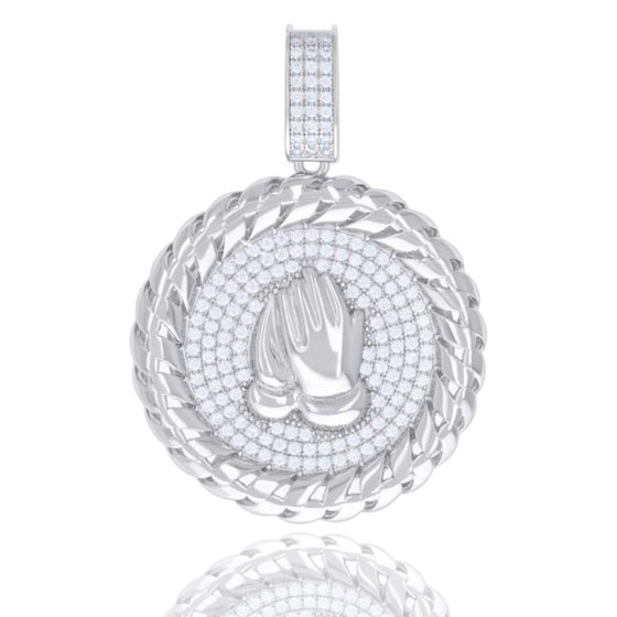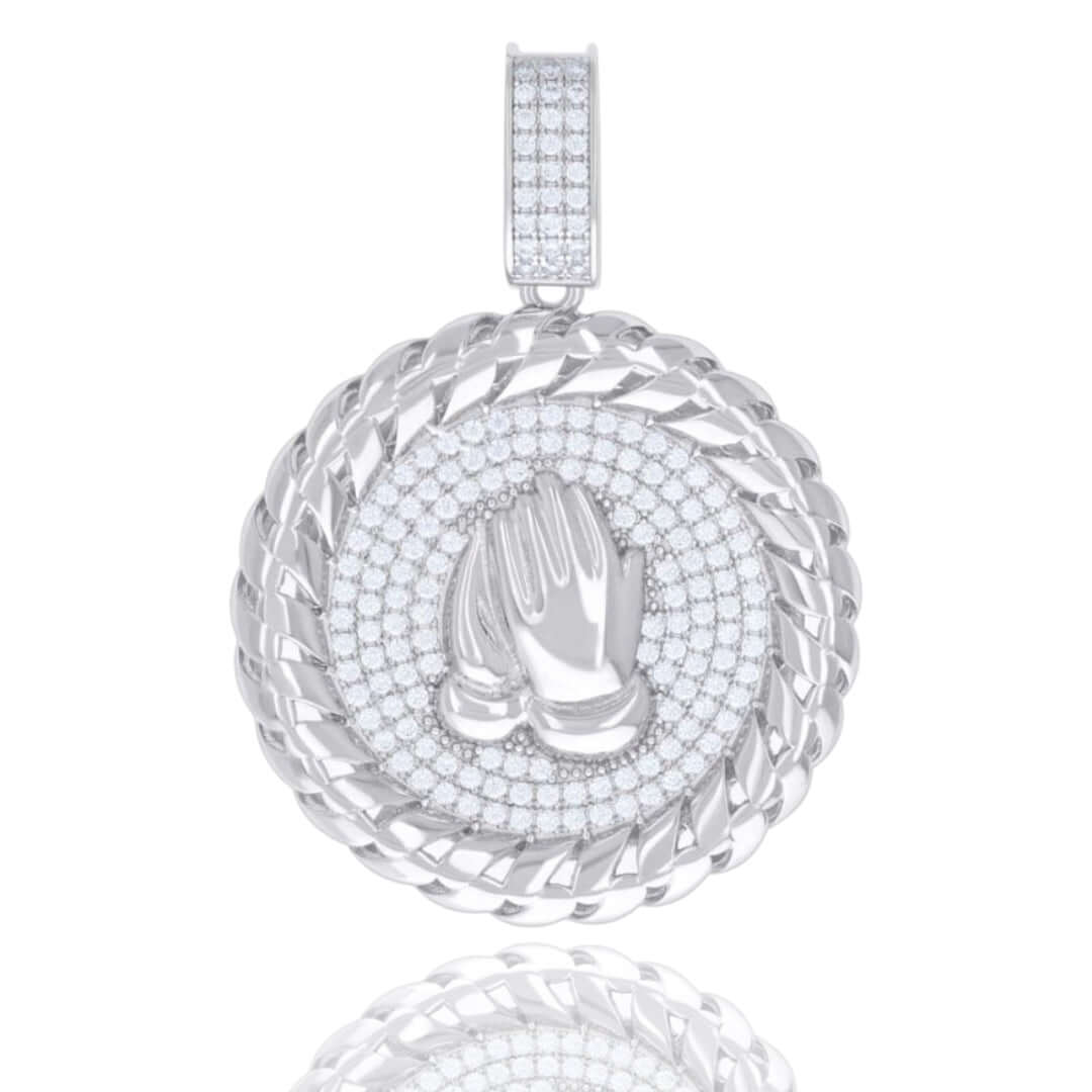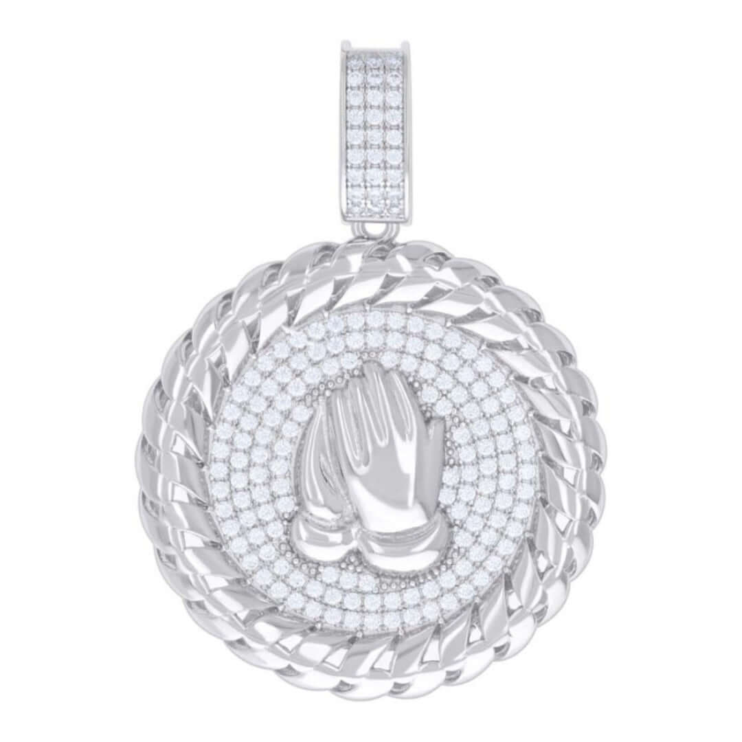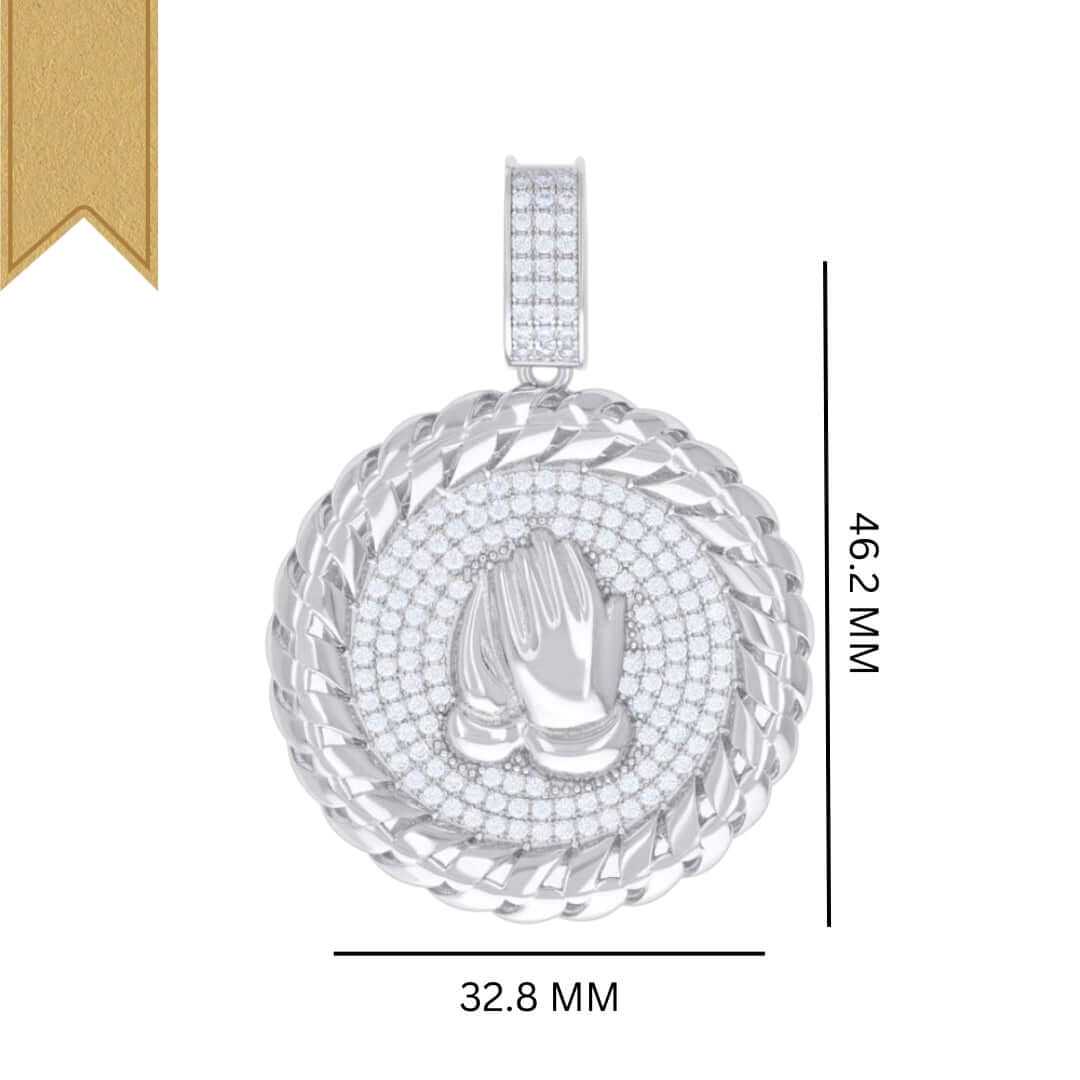 Alt="Crafted in 925 silver with VVS D-color moissanites, GOLDZENN’s Praying Hands Charm Pendant symbolizes faith. Hypoallergenic, tarnish-resistant & elegantly detailed."