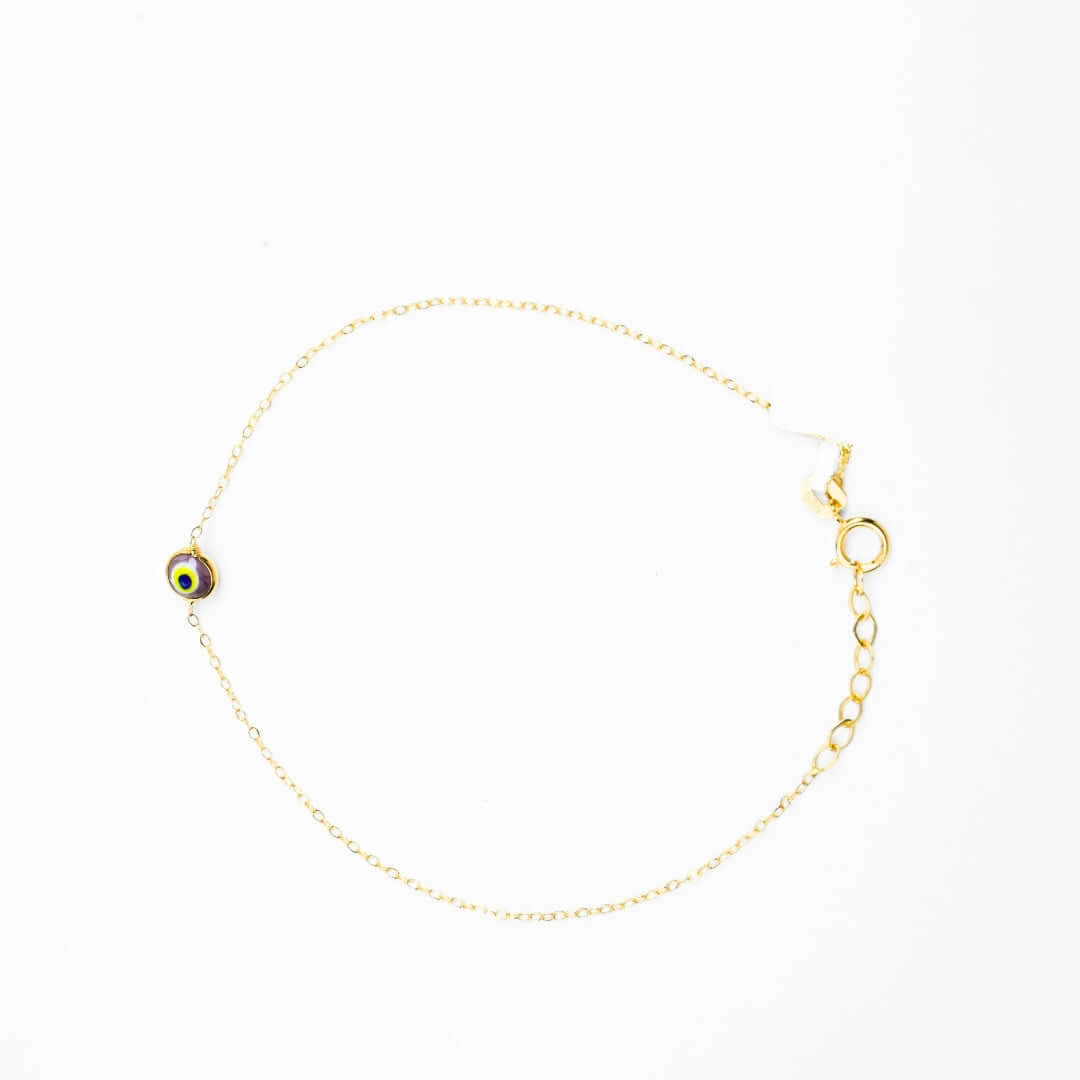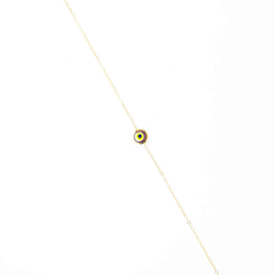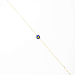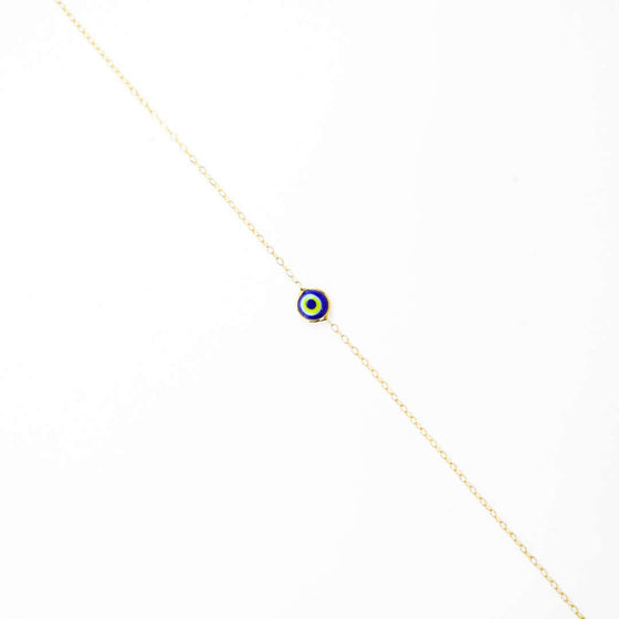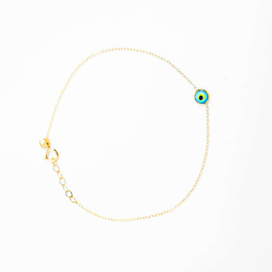 Alt="Discover the One Lucky Eye Bracelet in 14k gold, featuring a single protective eye charm on a sleek chain. Subtle elegance and spiritual charm—shop now!"