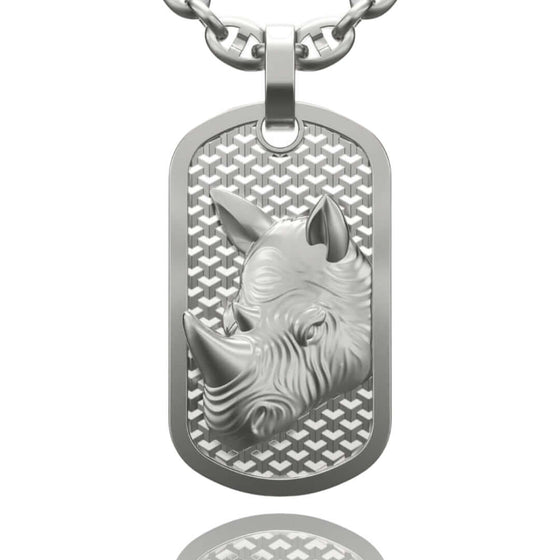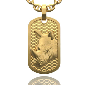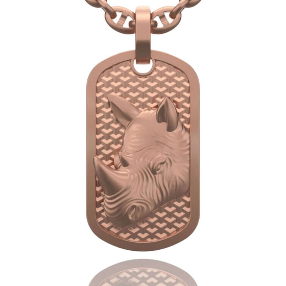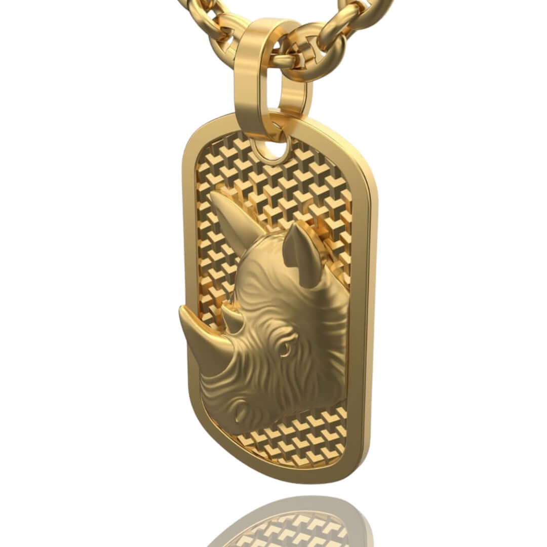 Alt="Explore the 14K Gold Rhino Dog Tag Pendant. A striking men’s gold pendant featuring a powerful rhino design in solid 14K gold for a bold, refined look."